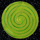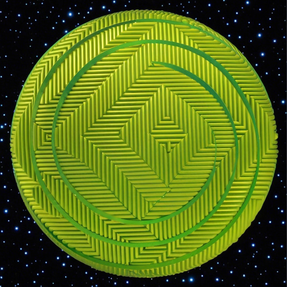 A synthetic image of a bright neon green sphere covered in horizontal and vertical cylindrical ridges forming a labyrinthine pattern. Circular grooves are carved into the sphere, revealing its underlying structure. The sphere is set against a black background with numerous small, glowing blue dots resembling stars.