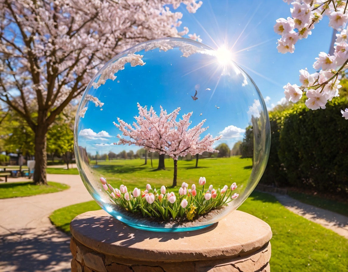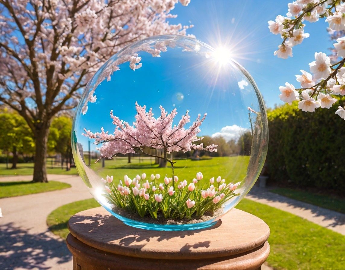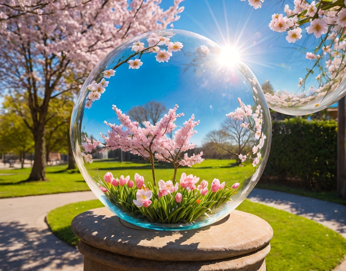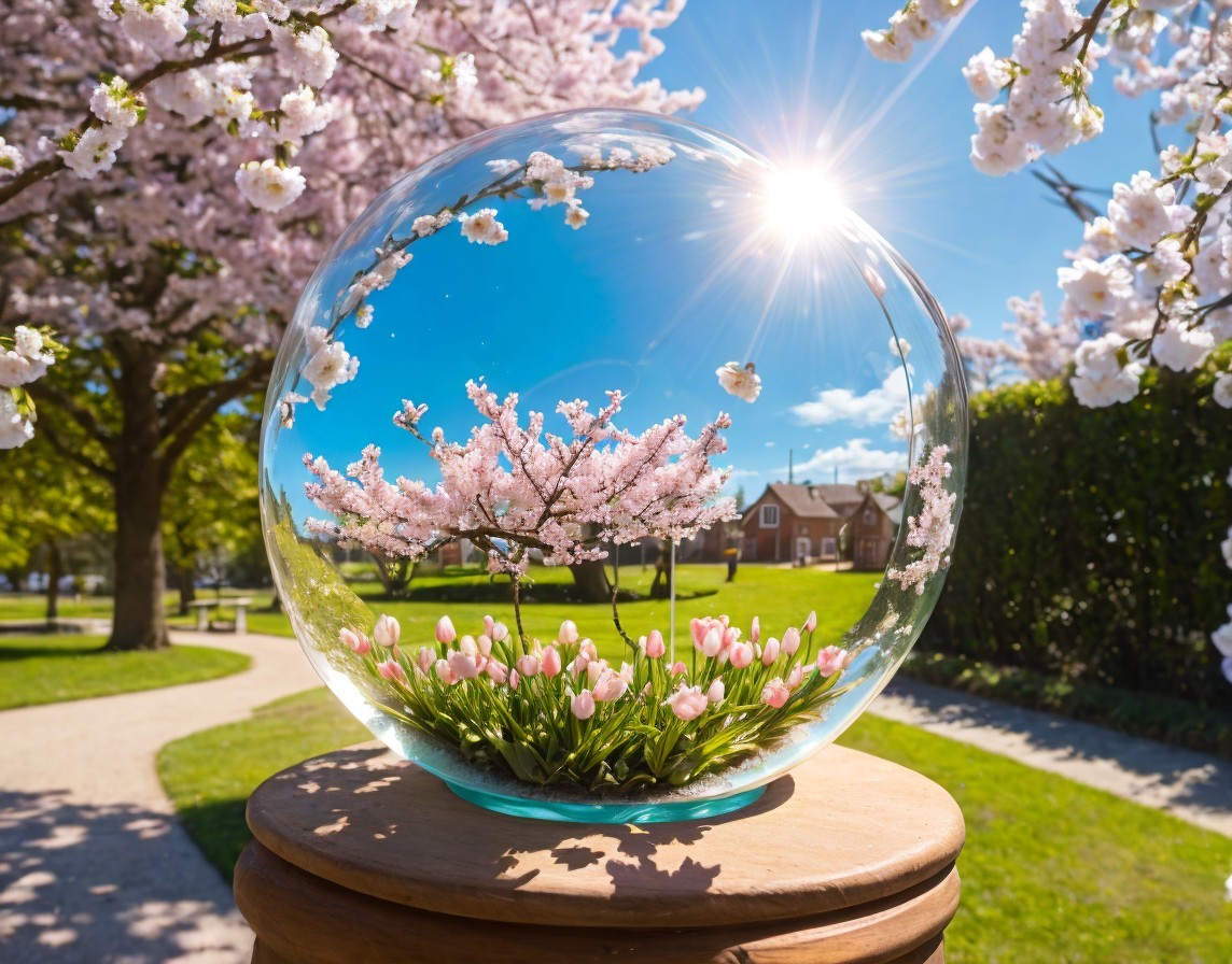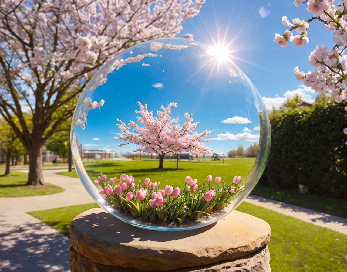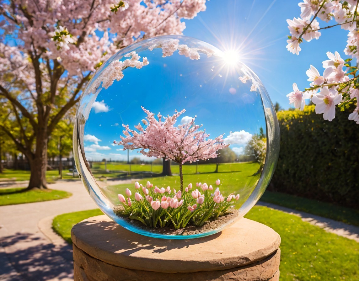 A crystal ball on a pedestal reflects a sunny park with blooming cherry blossoms and tulips, creating a captivating, upside-down image.