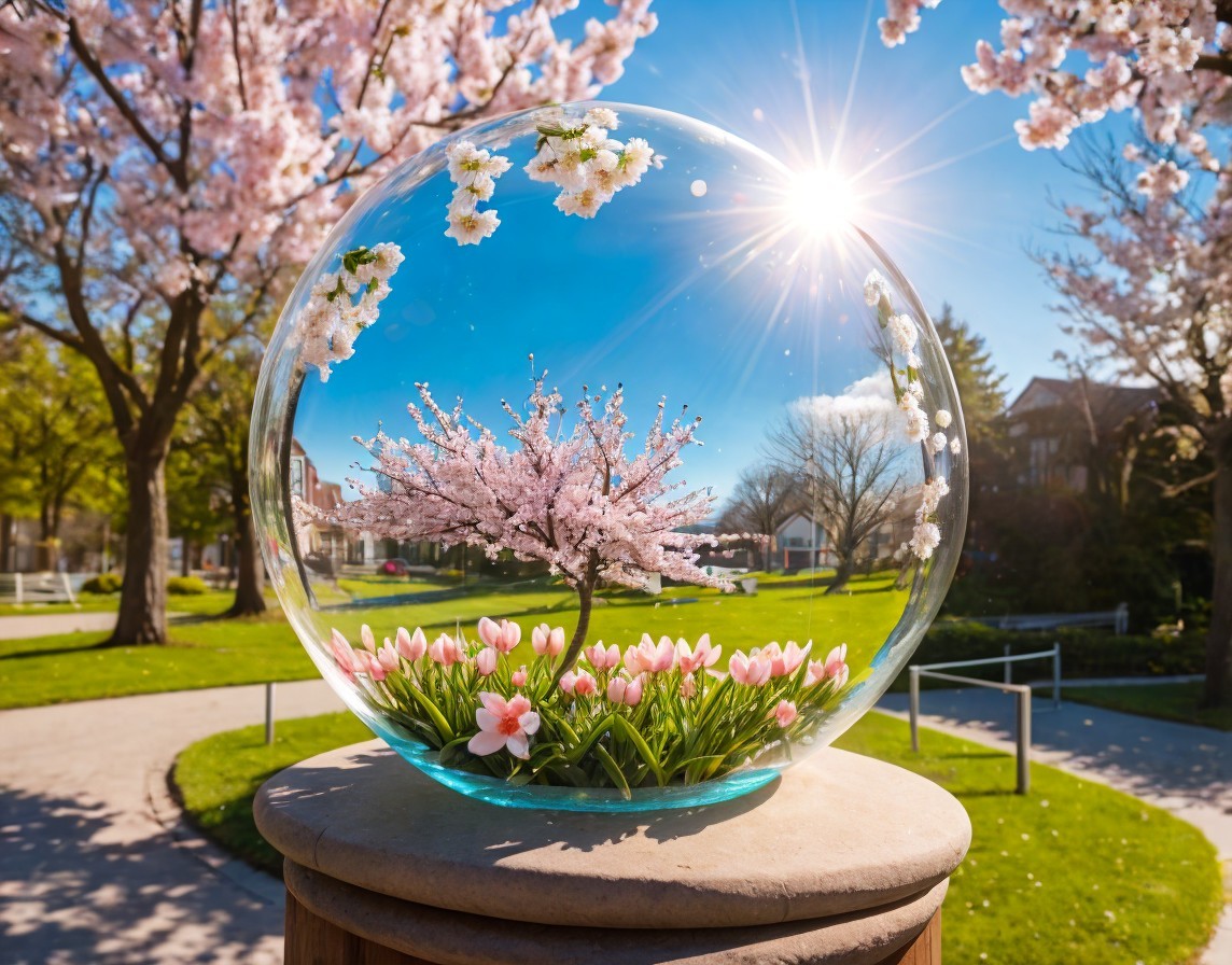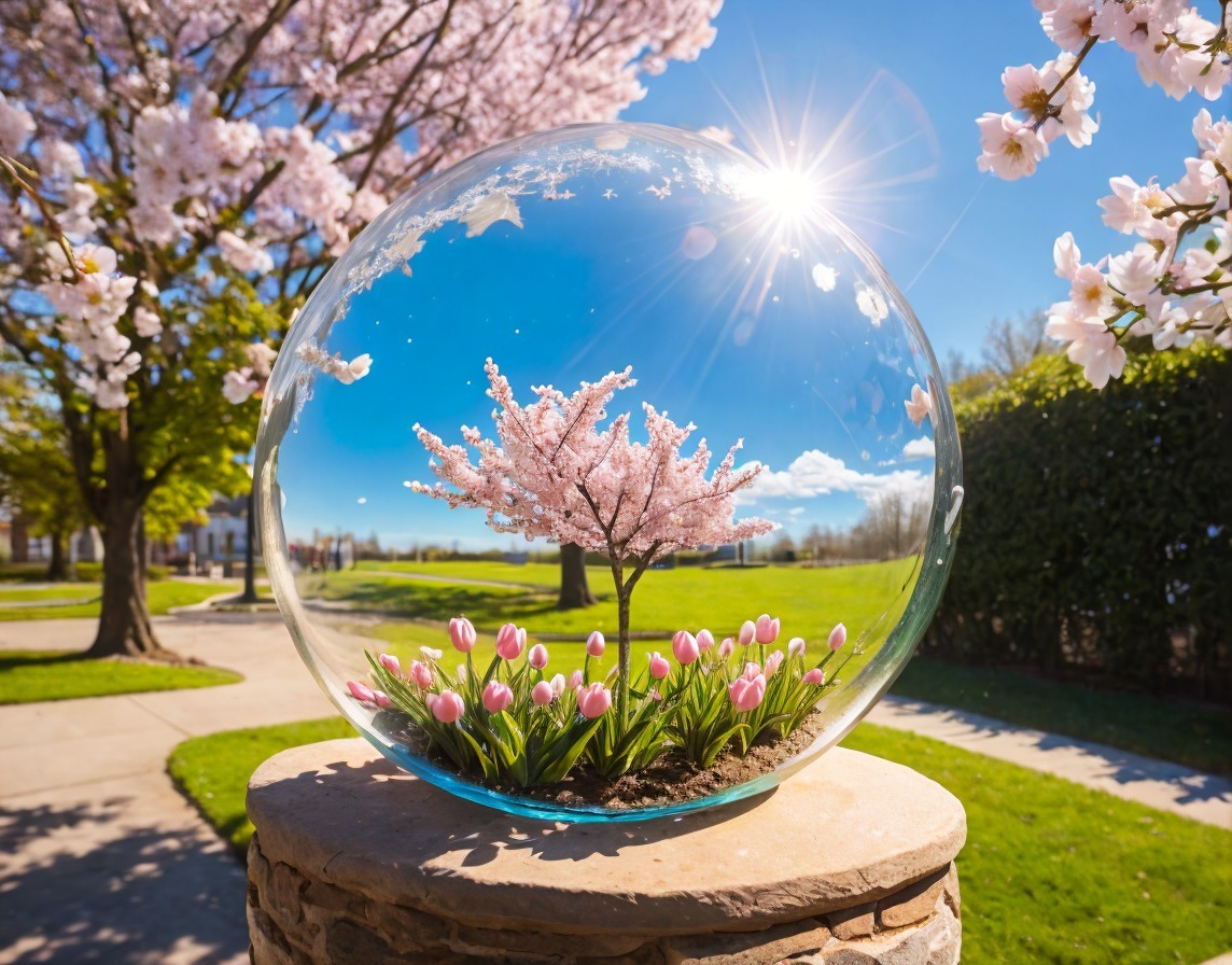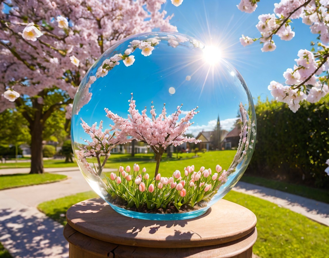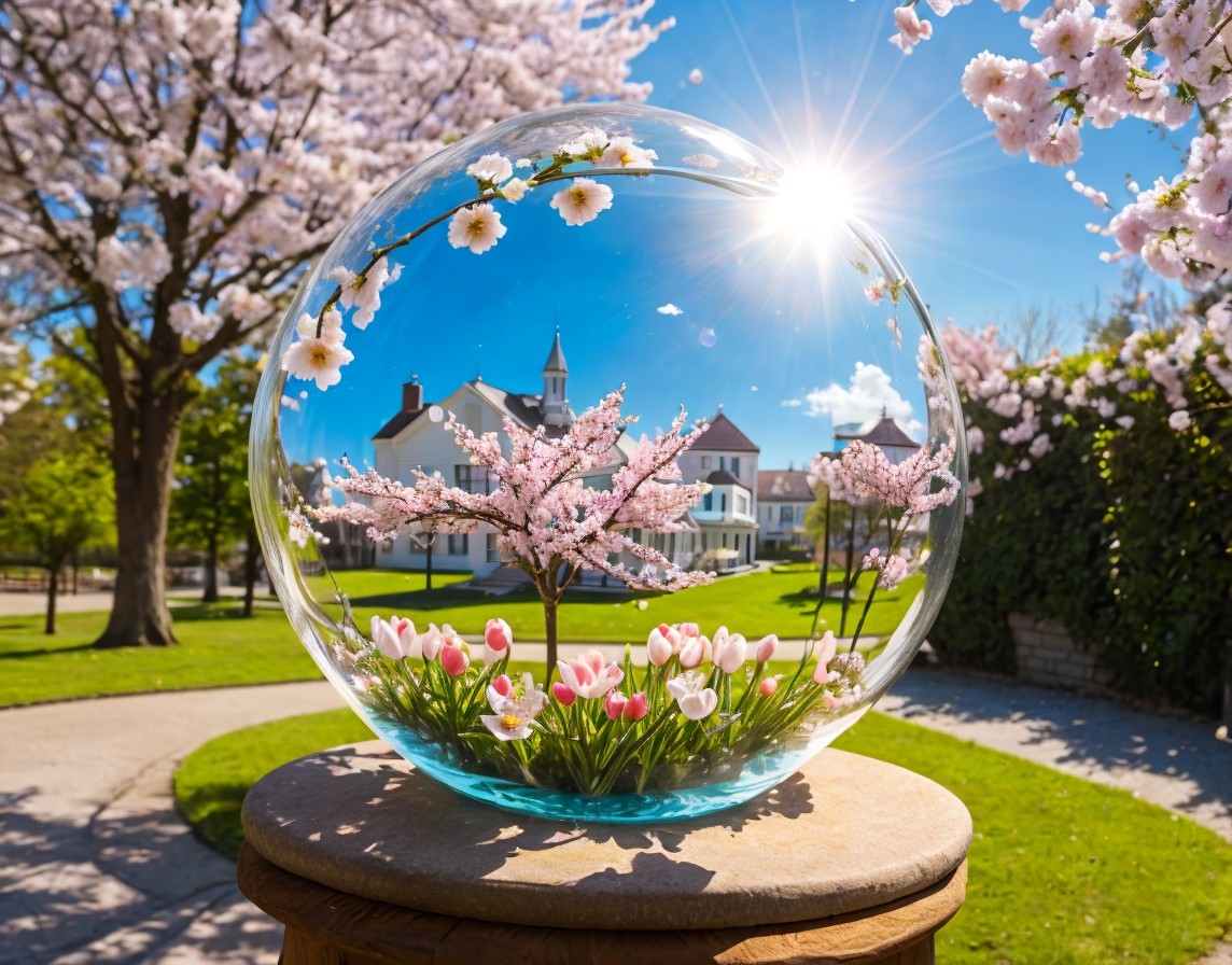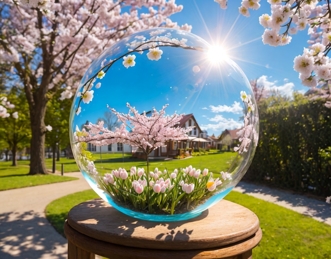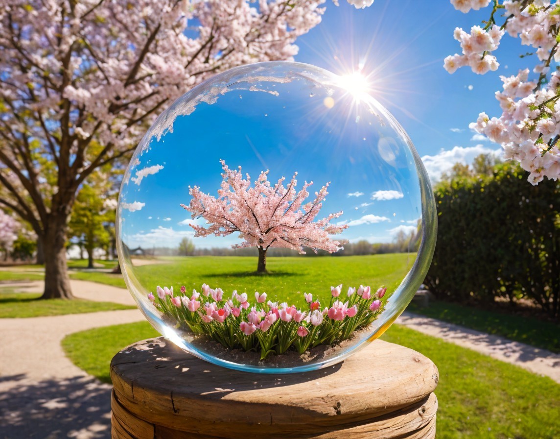 A crystal ball on a pedestal reflects a sunny park with blooming cherry blossoms and tulips, creating a captivating, upside-down image.