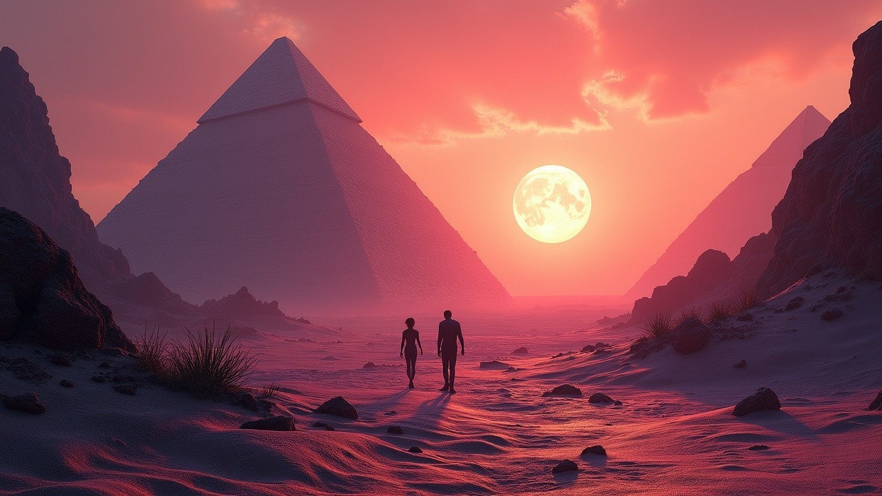 A mystical, extraterrestrial desert landscape at dusk, with colossal, ancient pyramids piercing the horizon, their rugged facades bathed in the warm, golden light of a vibrant sunset, as shimmering, iridescent sands stretch towards the horizon, reflecting hues of deep plum, rose, and amethyst; remnants of an alien civilization, with crumbling, overgrown structures, merge seamlessly with sleek, futuristic technology, while the silhouettes of intrepid explorers, clad in advanced, high-tech attire, venture into the unknown, their forms stark against the kaleidoscopic sky; inspired by the works of Syd Mead, H.R. Giger, and Simon Stalenhag, with a blend of realism and fantastical elements, rendered in exquisite, 4k detail, with dramatic, cinematic lighting, and an evocative, otherworldly atmosphere, perfect for an immersive desktop wallpaper.