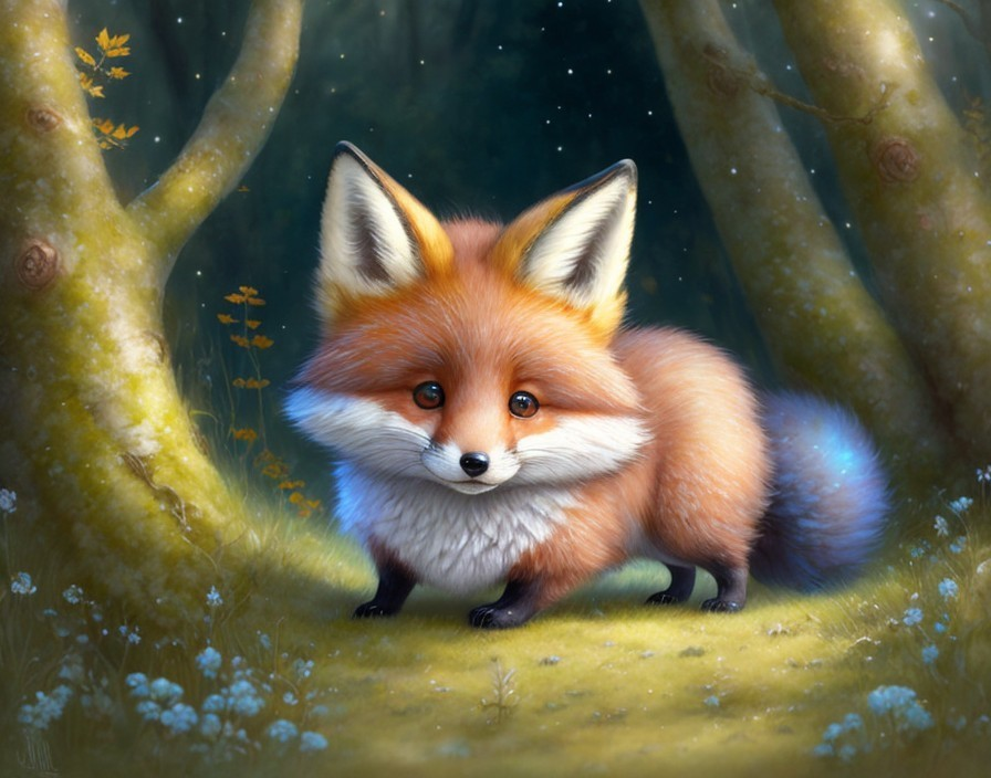 A vivid illustration of a fluffy red fox in a serene forest with glowing blue flowers and falling yellow leaves.