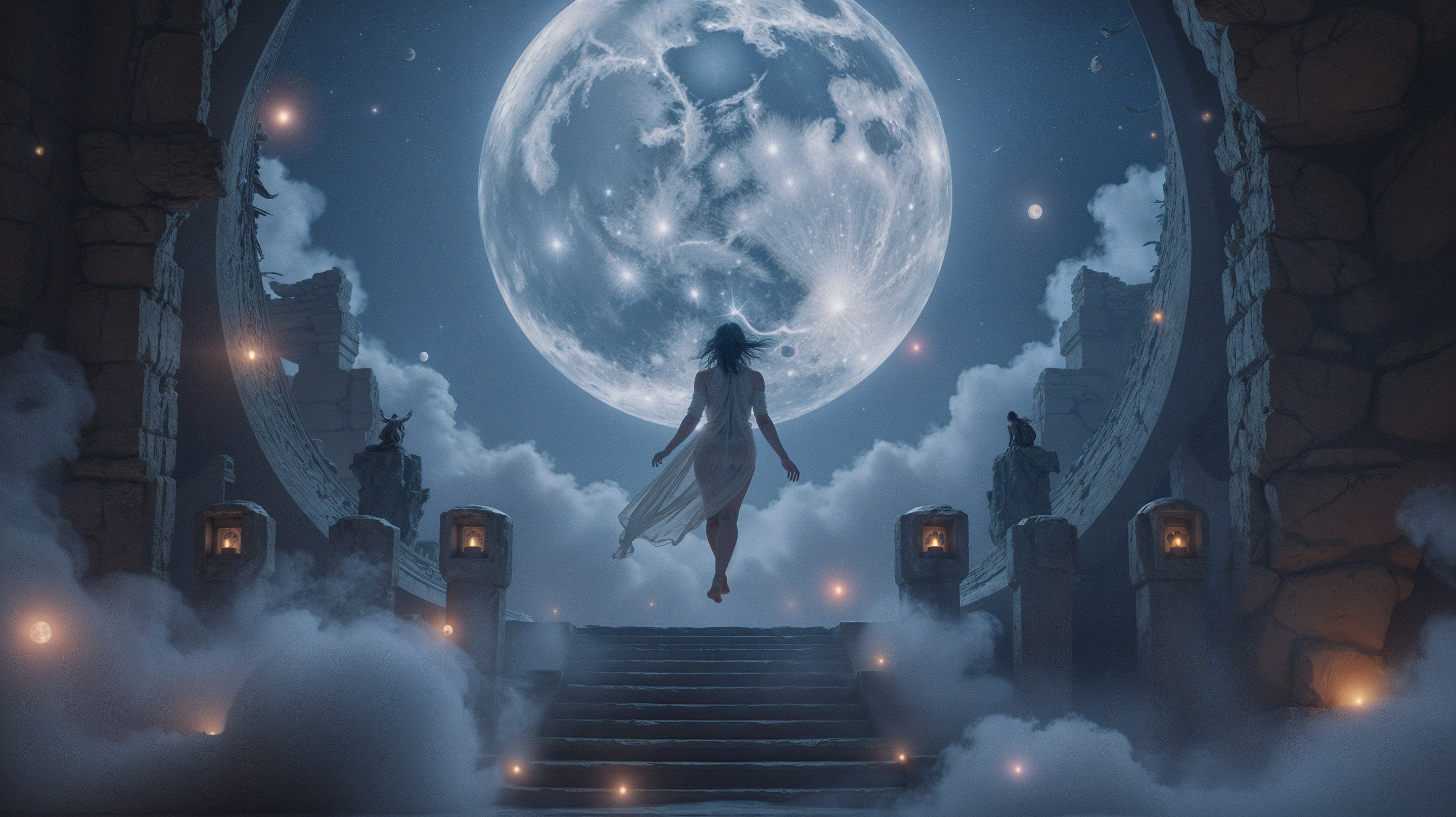In a surreal cosmic landscape, a woman in translucent robes ascends through a mystical aperture surrounded by floating temple fragments. Twin moons illuminate her path, revealing a realm of ethereal beauty.