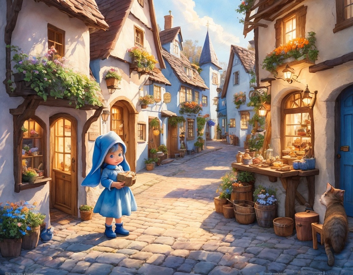 A whimsical illustration of a girl in blue in a quaint village with cobblestone streets, blooming flowers, and a cat by a cart.