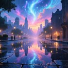 A vibrant cityscape at twilight, featuring skyscrapers under a swirling, colorful sky. The wet street reflects the hues, with glowing streetlights illuminating the scene amidst a gentle rain.