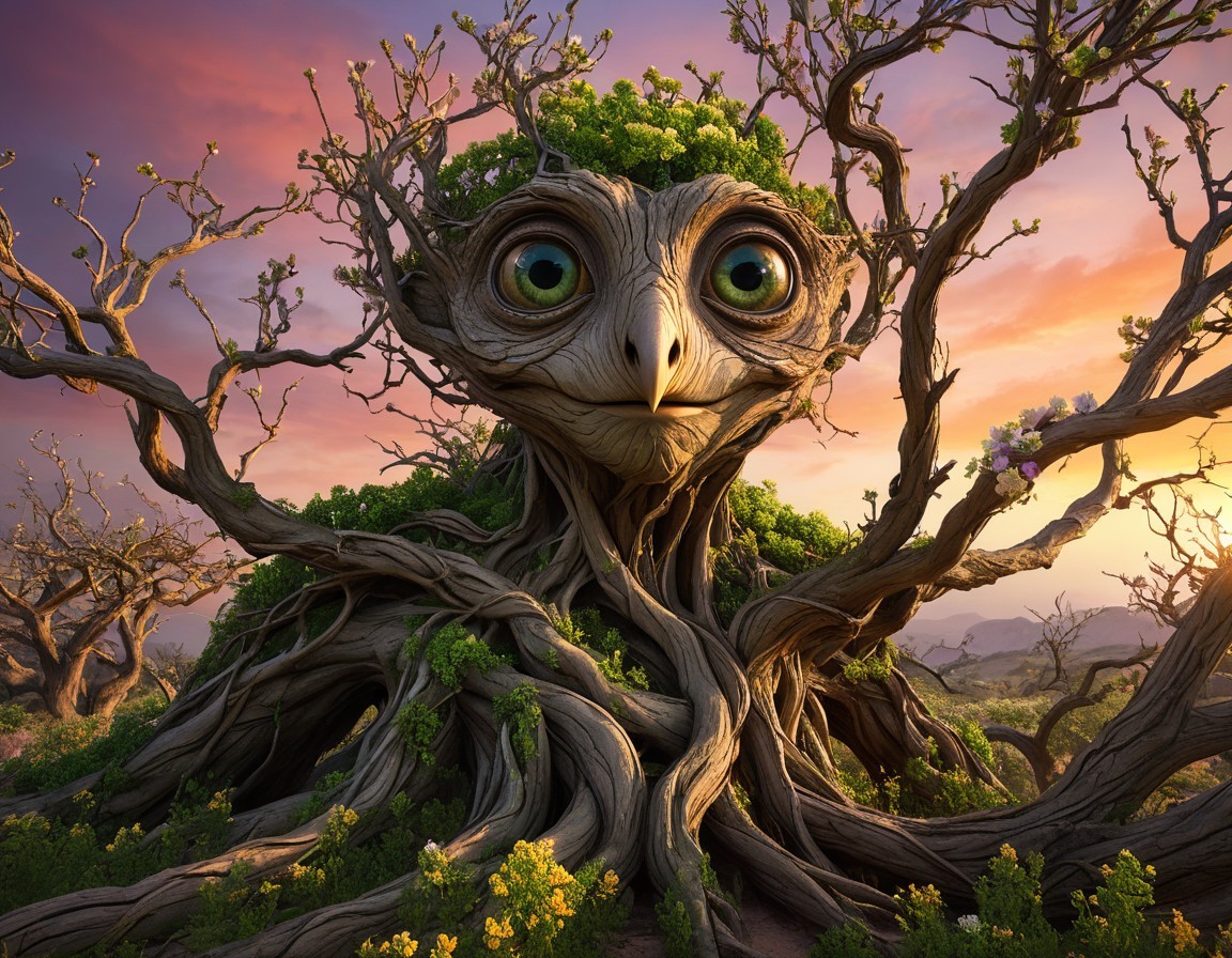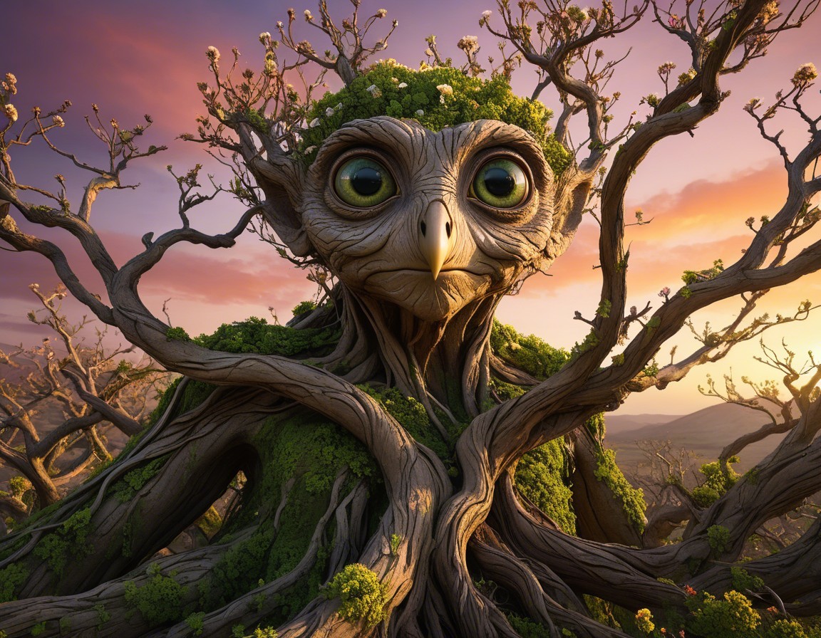 A whimsical creature combines features of an owl and a tree, with large expressive eyes and gnarled branches adorned with greenery, set against a vibrant sunset landscape.