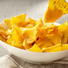 A bowl filled with crispy Nacho tortilla chips, some topped with gooey, melted cheese. The vibrant yellow cheese oozes over the chips, creating a tempting, savory snack.
