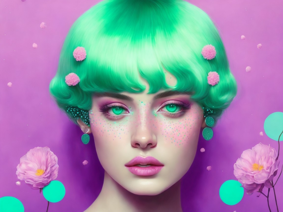 A surreal portrait features a young woman with vibrant green hair, dotted cheeks, and striking green eyes. The background blends pink and purple tones, adorned with soft flowers and colorful shapes.