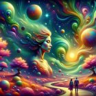A vibrant, surreal landscape features swirling colors, a celestial face emerging from clouds, and two figures walking along a winding path, flanked by pink trees and cosmic elements above.