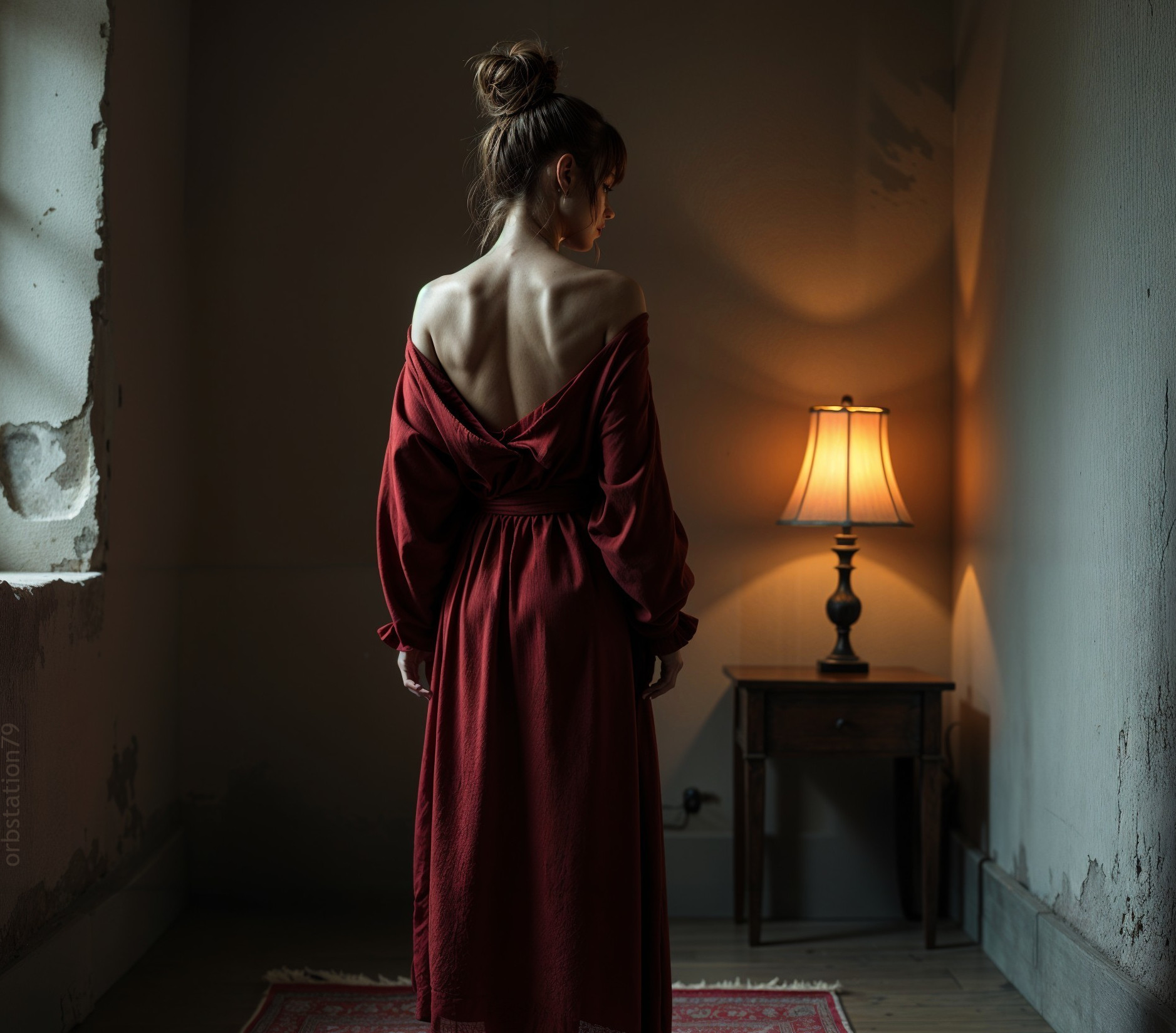 A hyperrealistic photograph captures a barefoot woman in a loose, unbuttoned deep red robe, standing in a dimly lit room. Her messy bun and downward gaze create a melancholic aura against textured walls and wooden floors.