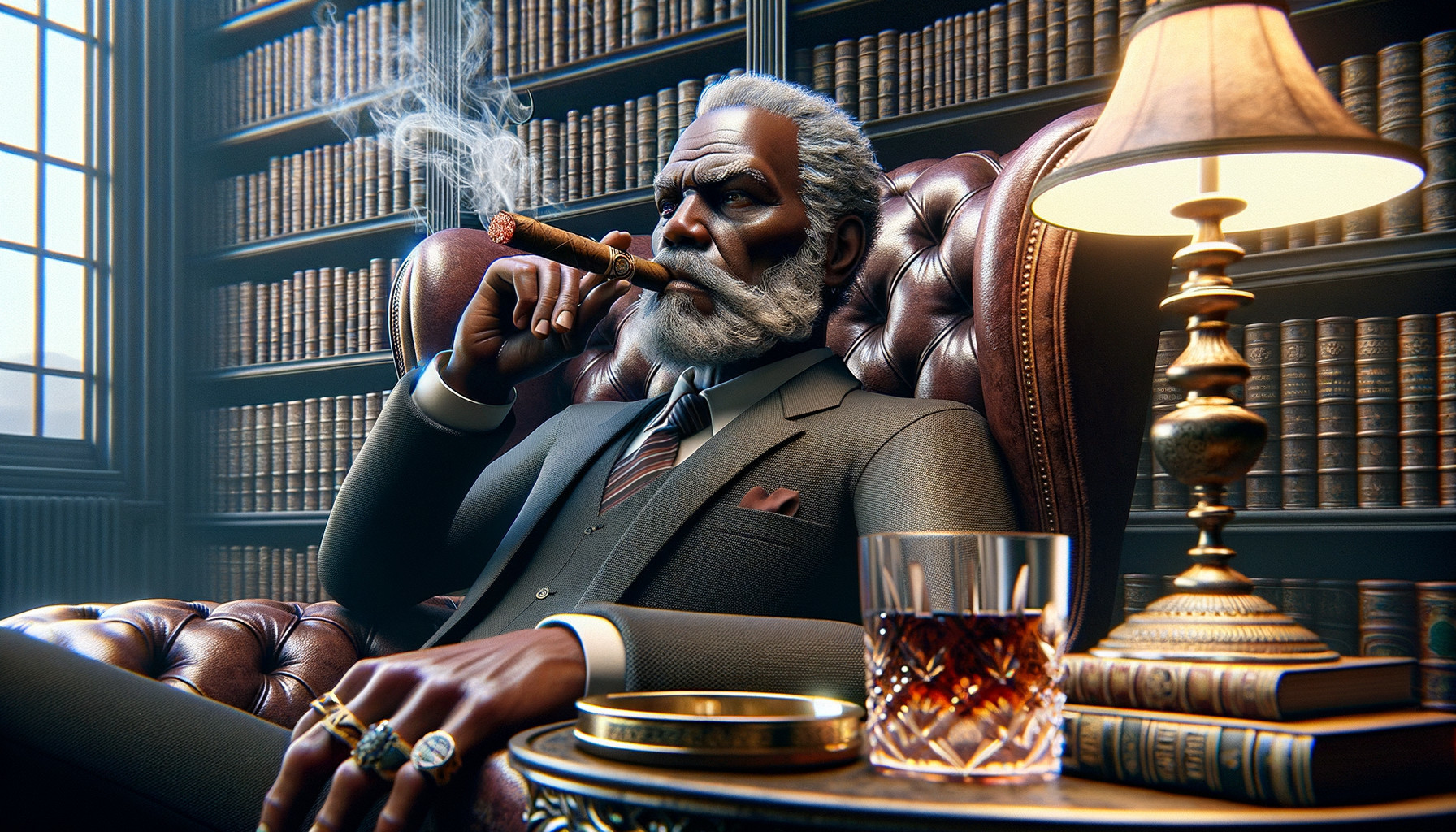 A distinguished man with a gray beard smokes a cigar in a library, his pensive gaze adding to the dignified ambiance.