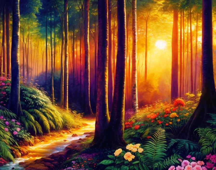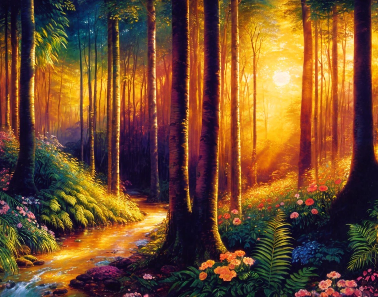 A serene forest at sunset, illuminated by warm golden light. Lush greenery and vibrant flowers line a gentle stream, creating a tranquil and picturesque atmosphere.