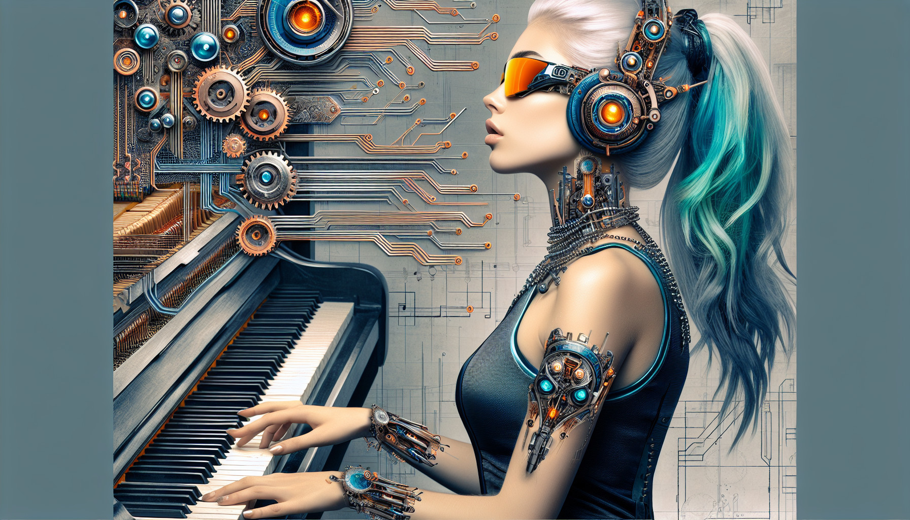 A futuristic depiction of a female cyborg with intricate mechanical details, blue hair, and orange-tinted glasses against an abstract background.