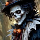 A sinister, yet stylish skeleton character dons a top hat adorned with feathers. Its skeletal face features bold red markings, set against a misty, atmospheric forest backdrop.