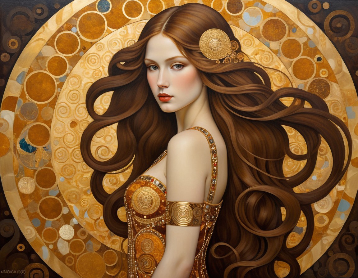 The artwork depicts a woman with flowing, wavy hair adorned with a golden flower. She wears an ornate, golden dress, set against a background of swirling circles and rich hues of gold.