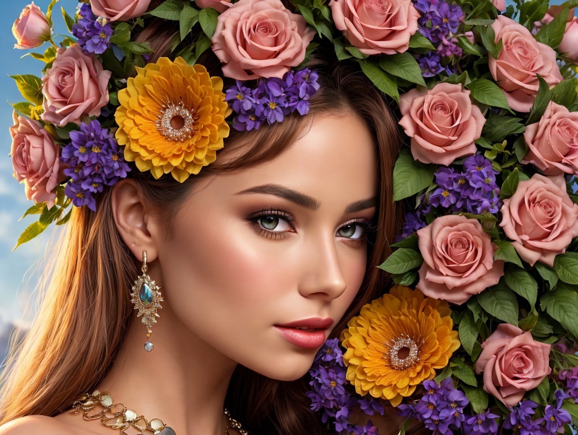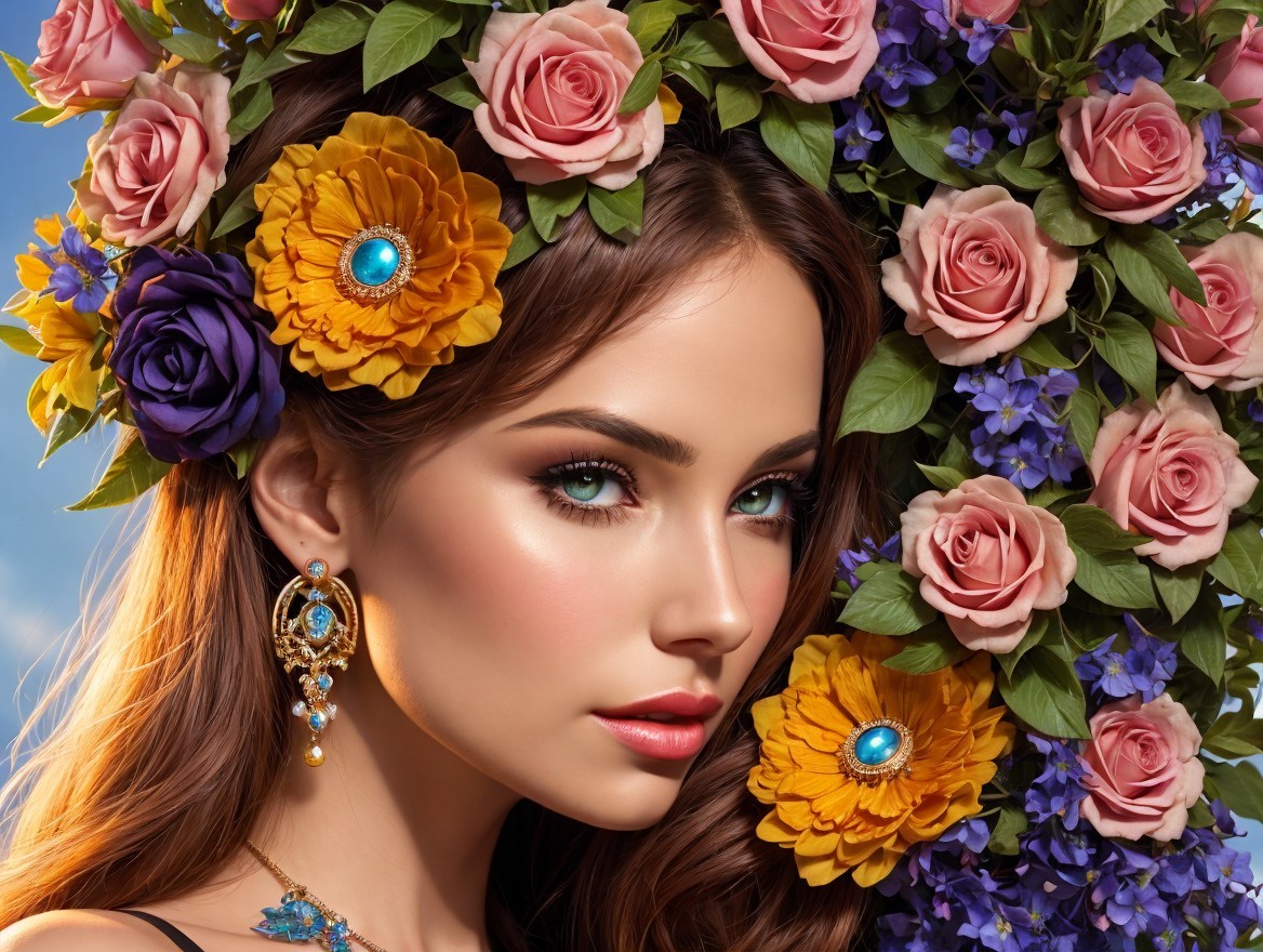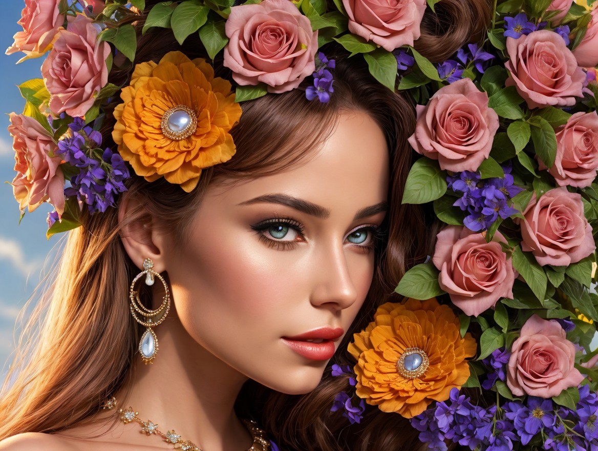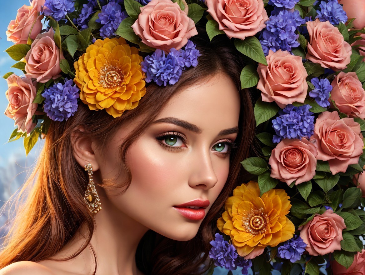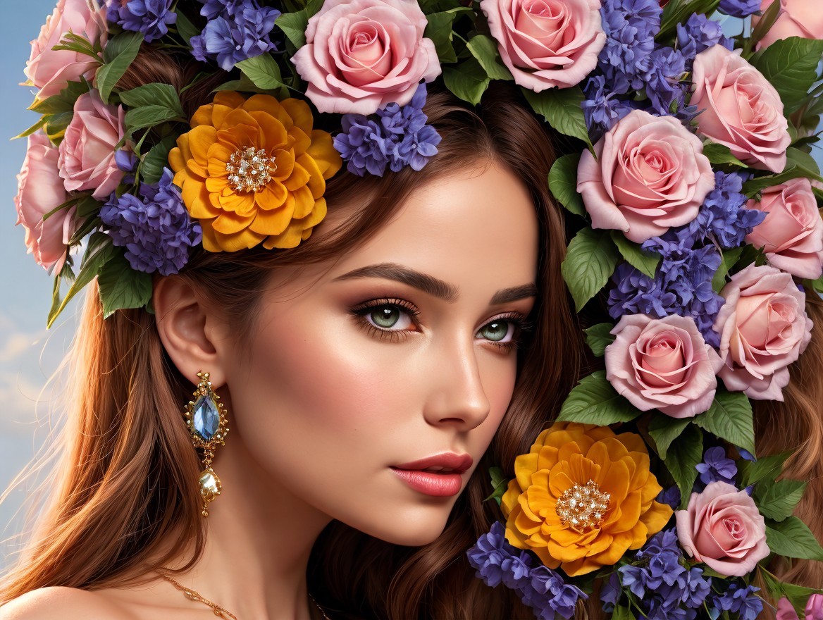 A close-up portrait of a woman with long, wavy hair adorned with a vibrant flower crown featuring pink roses, orange marigolds, and purple blooms, exuding a serene and enchanting beauty.