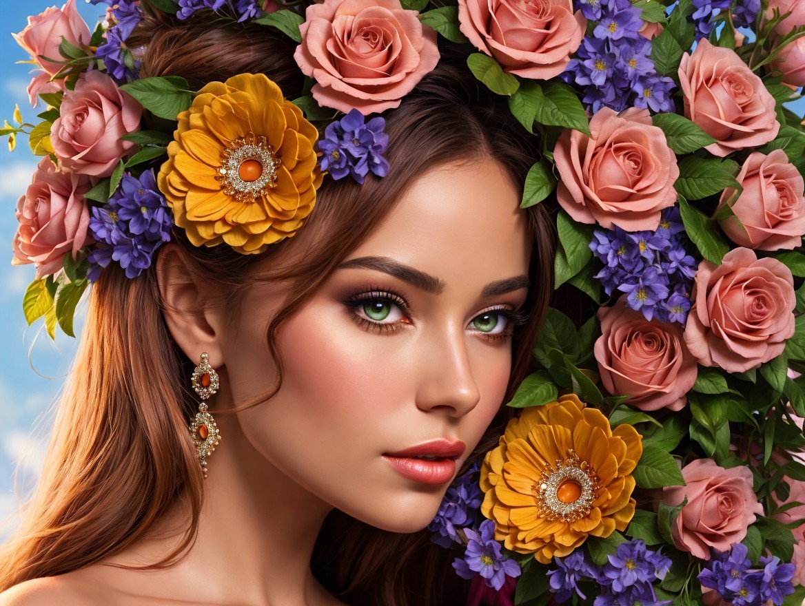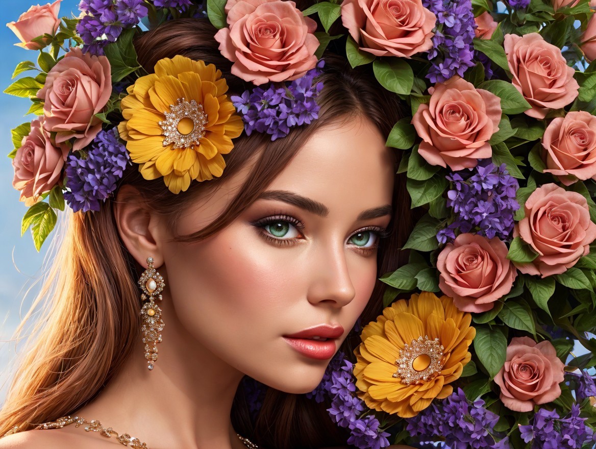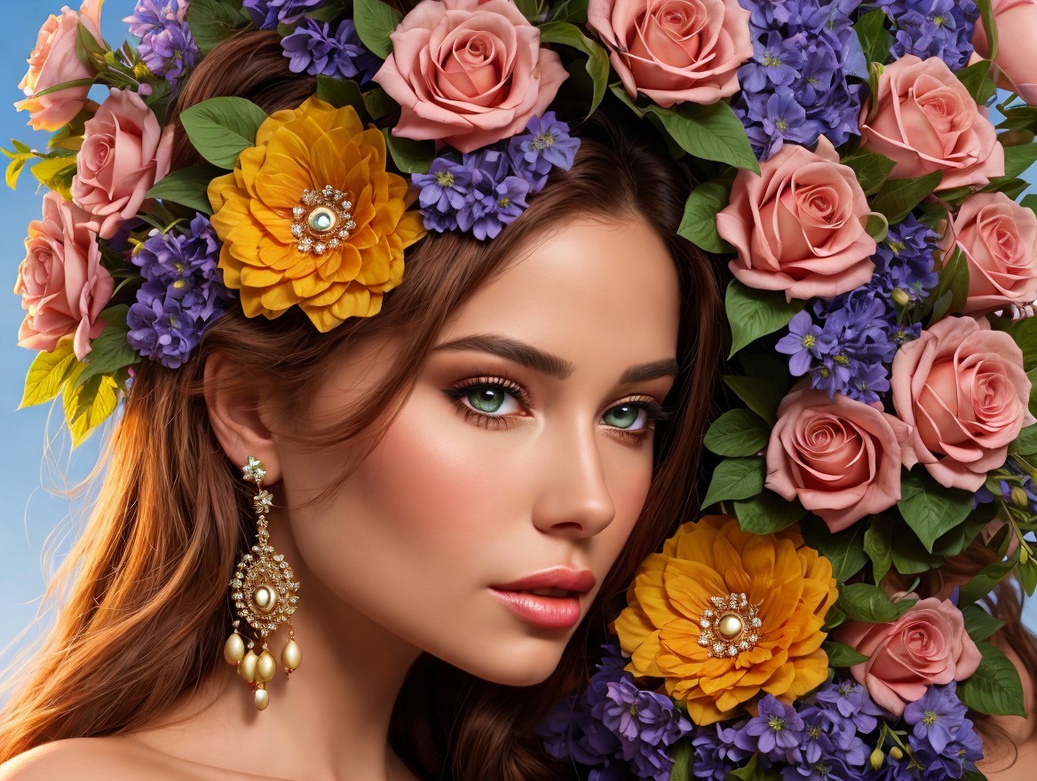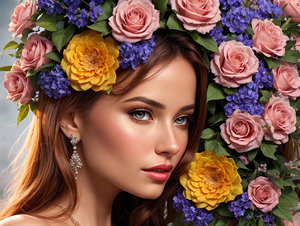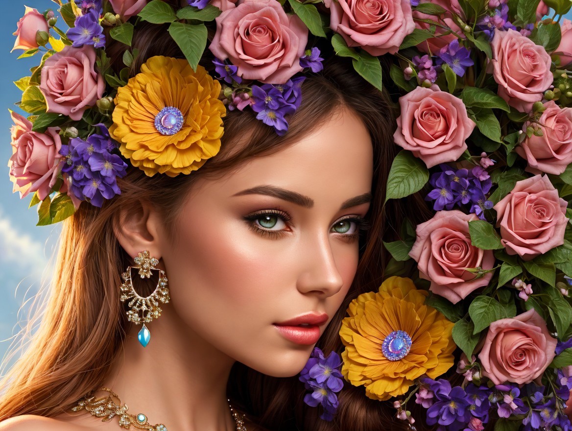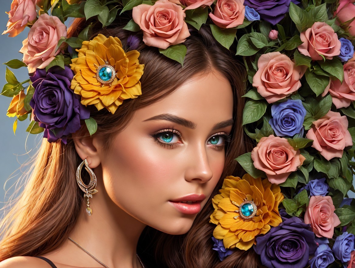 A close-up portrait of a woman with long, wavy hair adorned with a vibrant flower crown featuring pink roses, orange marigolds, and purple blooms, exuding a serene and enchanting beauty.