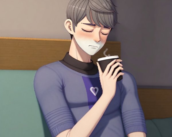A serious animated character with short, wavy gray hair and a beard sits outdoors, holding a small cup. He wears a dark suit, and the background features a blue sky and mountains.