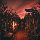 A captivating corn maze entrance illuminated by a vintage lantern, set against a stunning sunset with vibrant purple and orange hues, inviting exploration into the towering cornfields.
