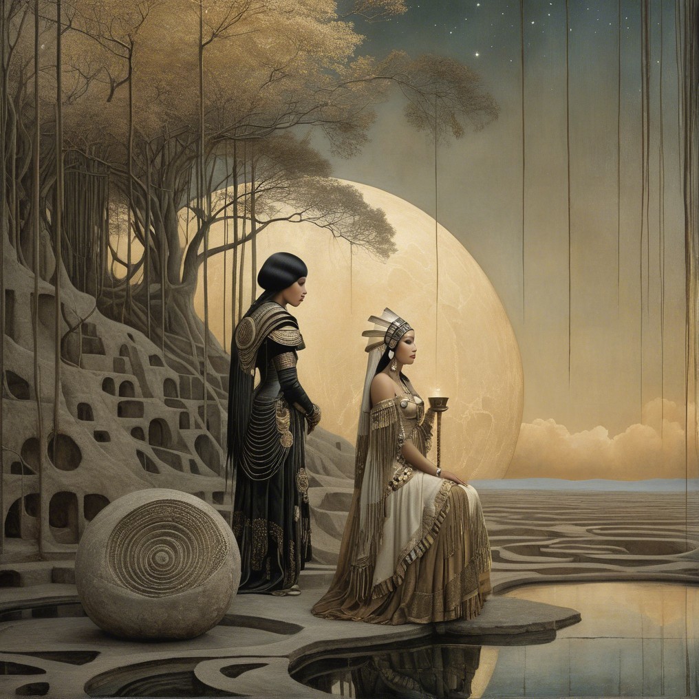 In a surreal landscape, two figures stand amidst twisted trees and intricate paths. One wears ornate armor, while the other dons a golden outfit and mask, under a giant moon and a serene sky.
