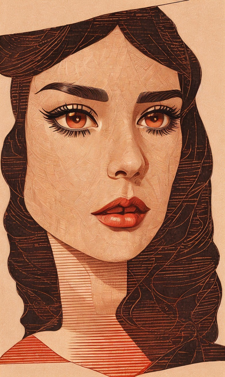 Stylized woodblock print, stylized line-art Portraiture, lineage patterns form beautiful female face, dark brown and muted red tones, (((hues, style by Overton Loyd, Tim Burton, William timlin, Meghan Duncanson, Jennifer Lommers, Margaret Keane, american gothic 1.9), Geometrical portrait of a woman with curly hairstyle) 8:5), lace-draped, realistic eyes, elaborated textures, highly textured colours, high-definition digital painting, tints of fantasy and surreal illustration. intricate details, graceful spirals, modernist fashion photography, detailed beauty, ,traumacore 1.4 , brightness 1.4, high coloring 1.7, geometrical illustrative style, Pastel colors of pink reddish-brown red, crisp quality, vector 9:5, intricate stylized hairstyle, perfect smirk handsface, zentangle method, cottagegore 1.9, american gothic 1.7, dynamic lighting 1.7, 3d effects 1.8, ambient occlusion 1.2, anisotropic filtering 1.2, raytraced shadows 1.8, stylized lineage illustration, delicate coloring, octane render illustration 1.5, geometrical features, aura with green glow, anatomical accuracy, sharp, limited pallet, zentangle method, dynamic lighting, inviting, very stylized illustration 1.8, soft rounded edges, quilling, moody, folded paper style 1.9, high plasticity, spiritual essence, beautiful composition, raytraced shadows 1.8, beautiful composition 1.9, high coloring 1.9, brightness 1.9, tints of pixar and linocut