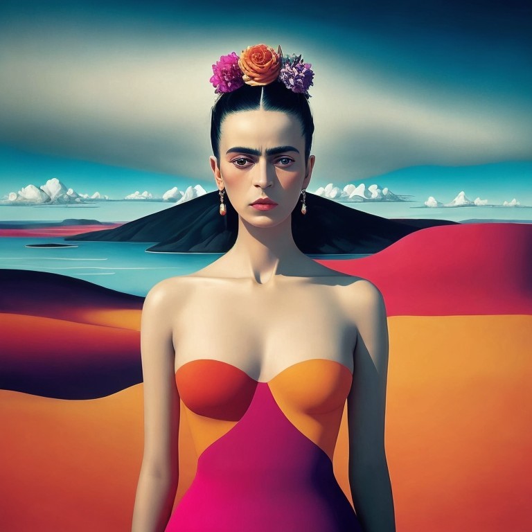 A woman's portrait transformed into a surreal landscape. Elements of the woman's form morph into surreal features or landscapes. Dreamy and thought-provoking mood. Surrealism, blending the realistic with the fantastic. The fusion of form with surreal elements, creating a narrative beyond the visual. A dream-like color palette with unexpected color combinations. Salvador Dalí, Frida Kahlo, Man Ray.