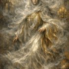 A beautiful woman with long, flowing white hair, fair skin, and striking blue-green eyes, wearing an intricate golden and white ornate traditional gown. She is adorned with golden jewelry including a golden halo, elaborate earrings, a necklace, and armbands, all featuring circular patterns and delicate golden tassels.