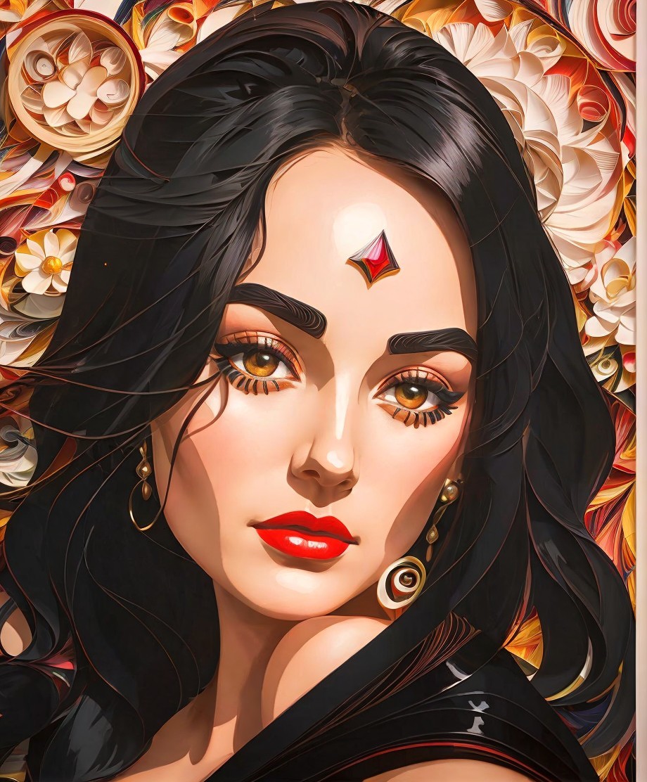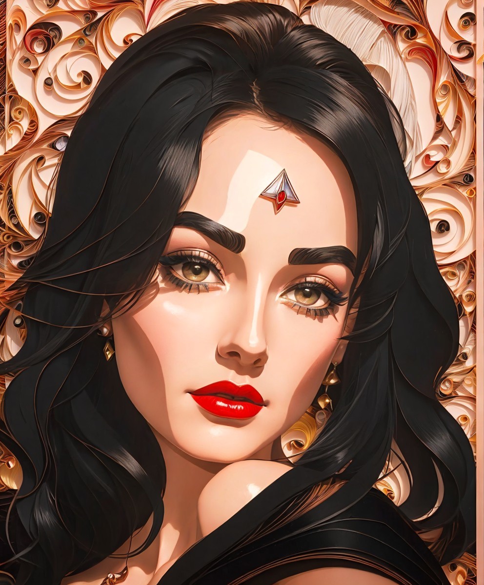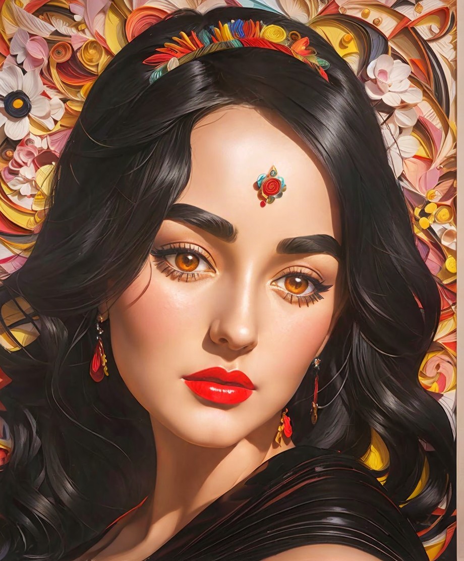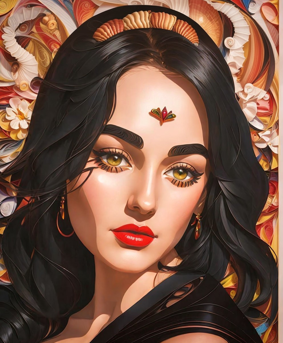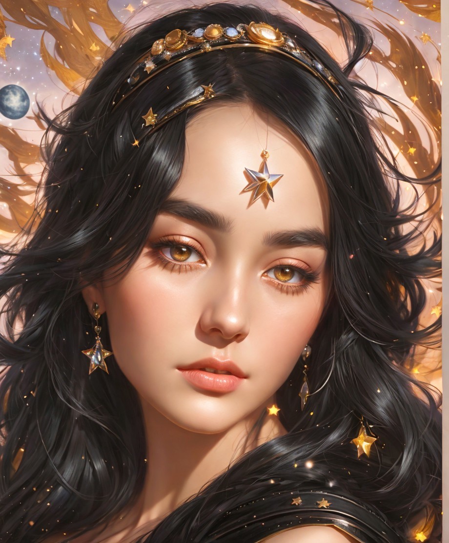 Stylized Portraiture of black haired female with hairband in style of Stylized Portraiture, high definition rendering, moonlit starry sky glows in the background, blending with a dreamlike dramatic stylization, Zentangle, 3d effects, soft pastel colors extremely detailed, intricate, best quality, hdr, uhd, lilac and yellow color palette, soft rounded edges, quilling, Gothic fantasy, magical realism, visionary art, filigree, colorful patchwork, Pellucid and translucent details, colored pencil sketch, stacked-up perspective, brightness 1.9, ambient occlusion 1.2, limited palette, triadic color scheme beige red ochre, detailed collar, Metallic Colors, high coloring, plasticity 1.3, wavery texture patchwork, dynamic lighting from top to centre, stylized illustration, action pose, hues, raytraced shadows 1.8, Plushy expressionist cuts stylization and realismo mágico, 3 layers in logarithmic distance with DOF, glossy, erotic, close-up portrait, wavy --ar 4:5 --style raw, rough gritty texture, modern, 64K, UHD, HDR, HQ, 4K 3D, fantasy cinematic lighting, ethereal, ultra detailed, dramatic, VRay, dethereal, overall stylized illustration 1.5, subtle coloring, plasticity 1.3, auracore, tints of american gothic 1.3, wavery muted colors, custom_loss:edge, pure bright colors, style of Alberto Seveso, Camilla D'Errico, Igor Sava, Jamie Hewlett, deja Thoris, Charles Thomas Burt, Josan Gonzalez, Rob Gonsalves, Margaret Keane, harrison fisher, William Turner, Gustav Klimt, Maxfield Parrish, Tamara de Lempicka, hypermaximalist, psychedelic coloration, serene, 16k resolution, Molecular , liquid, juvenile beauty, enlightened