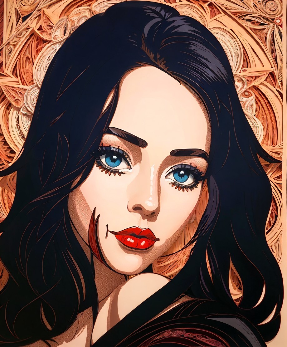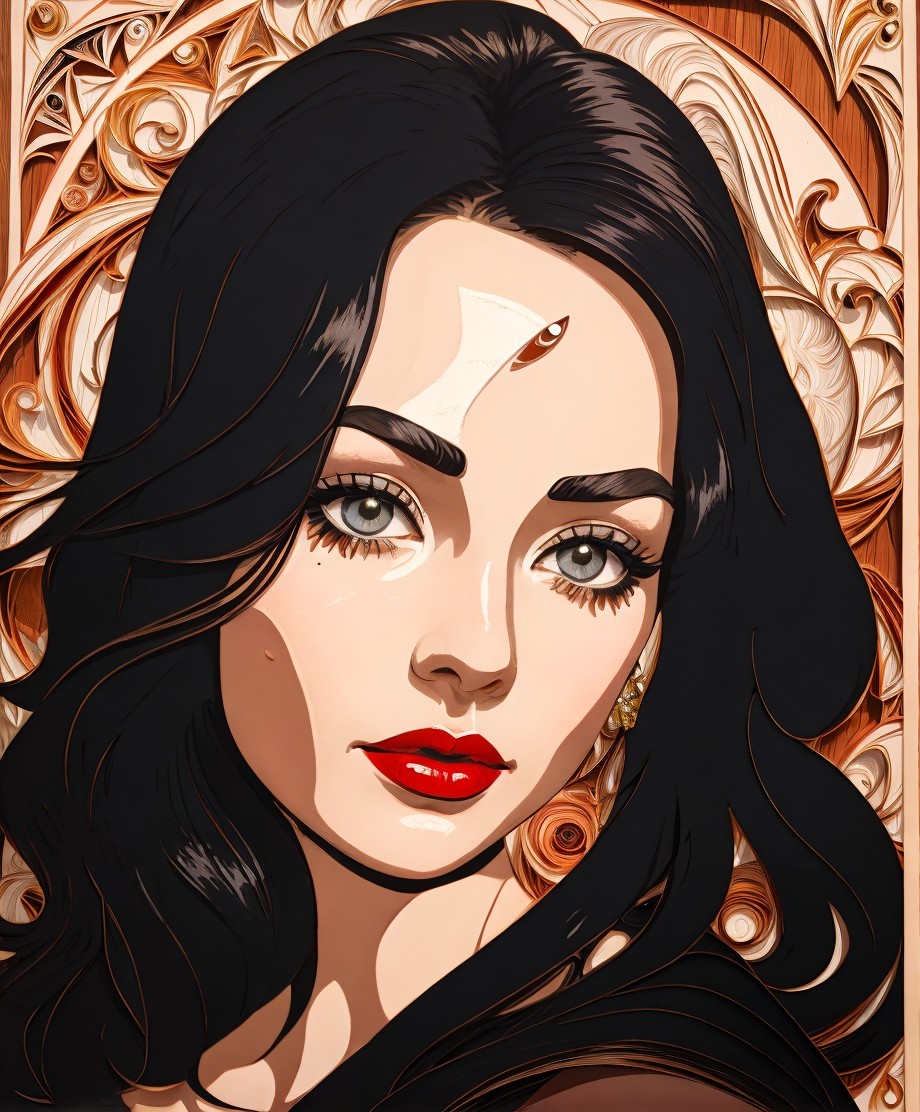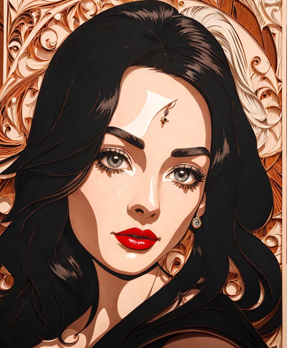 Stylized Portraiture in style of edward Hopper and Dejah Thoris and Georges Braque, fauvistic cuts, stylized woodblick print, quilling, glossy, Plushy cuts, sublime, eldritch, dark rim lighting from top to centre, stylized lineage illustration, delicate coloring, simplistic hairstyle in stacked lines, glossy, erotic, close-up portrait, wavy --ar 4:5 --style raw, rough gritty texture, modern, charcoal sketch textures and squiggly lines, fiery.colored, illustration on wavery auburn background, high-contrast features: pretty pale skin, brown hair, striking bioluminescent eyes, bold auburn lips, splashing ink-like drips originating from her hair, sharp. streaks of red and auburn flowing downward, custom_loss:black, embossed strokes, triadic color scheme auburn beige red, Figurative, comical, Stylized woodblock print, headshot, stylized, traumacore 1.9, beautiful composition 1.9, space age style merged with marvel comic book art style, stylized line-art, layered geometrical vector illustration, hues, custom_loss: black, encaustic streaks in stylized depiction, fine strokes, concept art, academical art, fauvistic fantasy essence, beautiful composition 1.9, coffinwood 1.7, sift rounded edges, dethereal, anisotropic filtering 1.7, raytraced shadows 1.8,