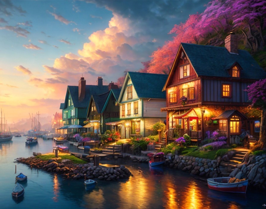 Coastal scene at dusk with illuminated homes, moored boats, and vibrant sunset clouds reflecting off calm waters.