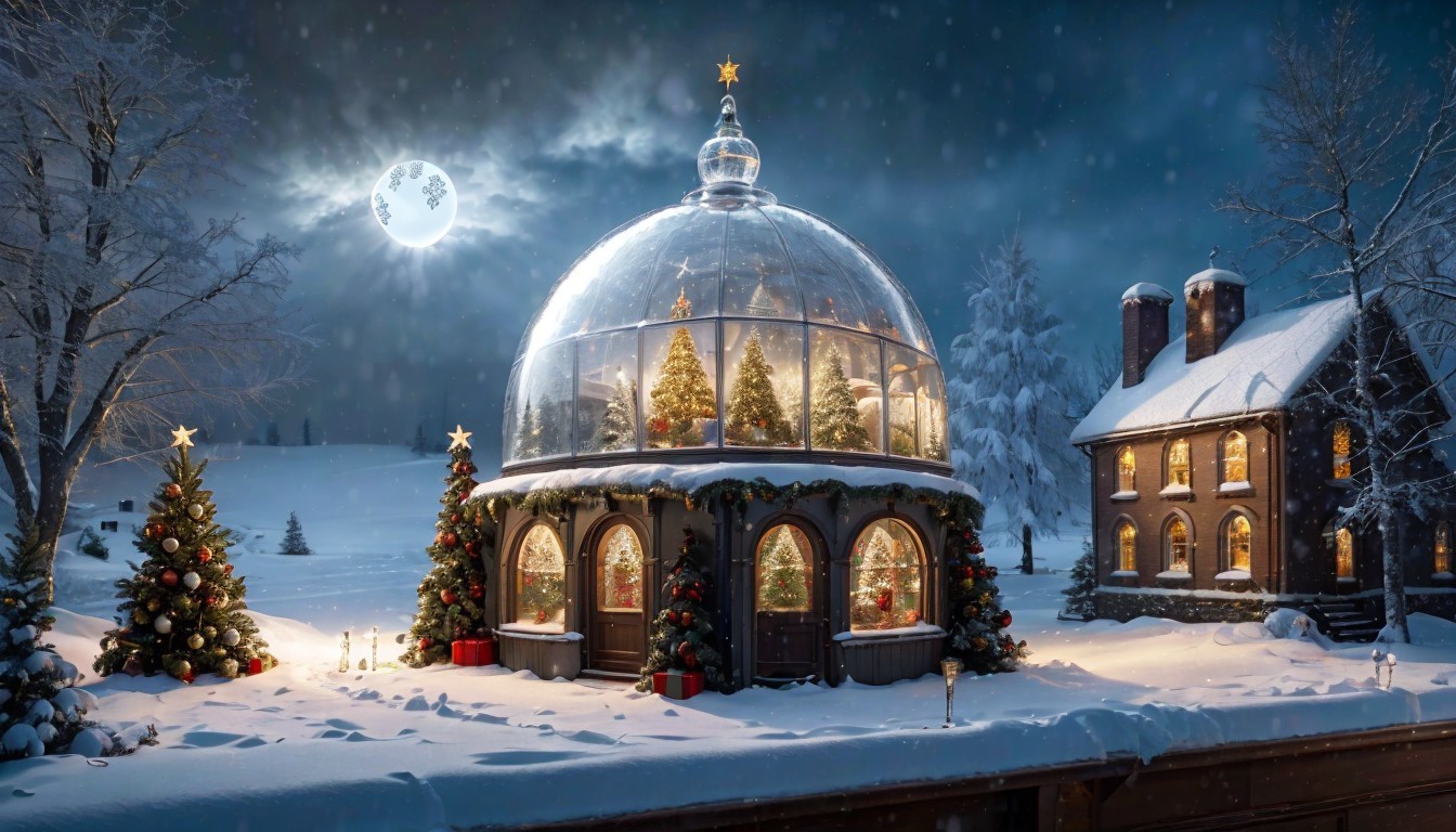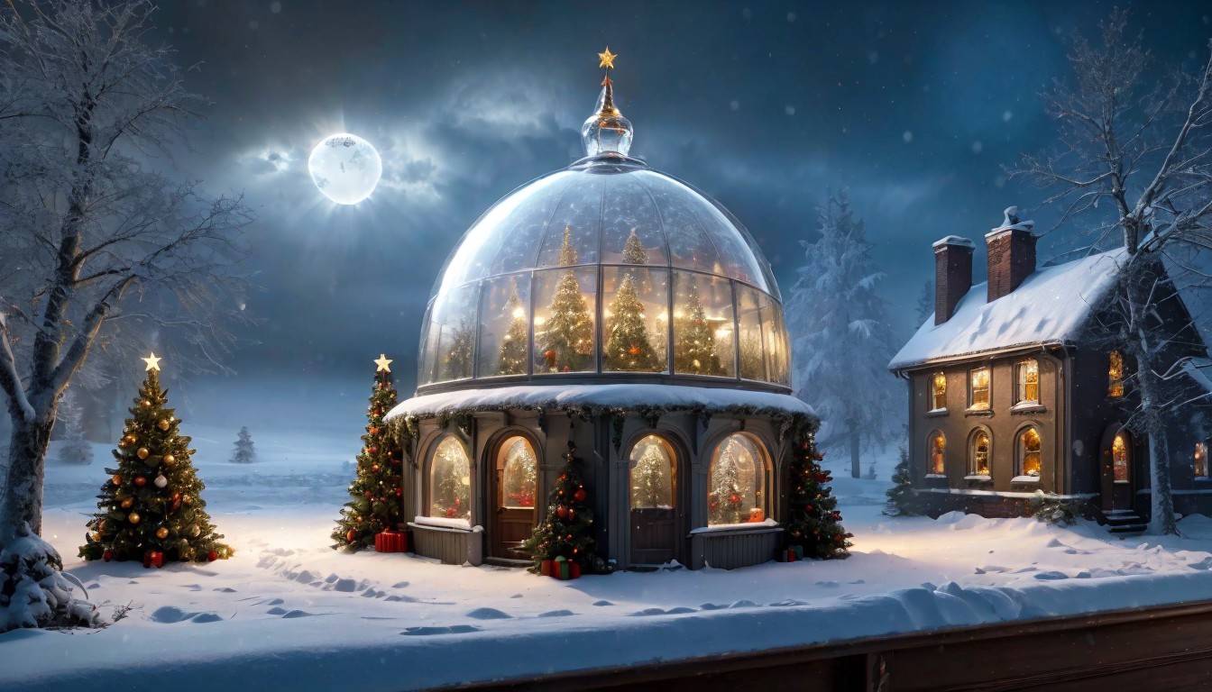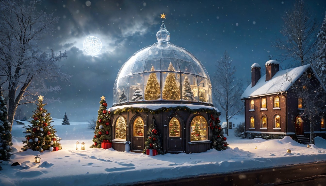 A festive greenhouse adorned with Christmas lights stands beside a snow-covered house under a starry winter night sky.