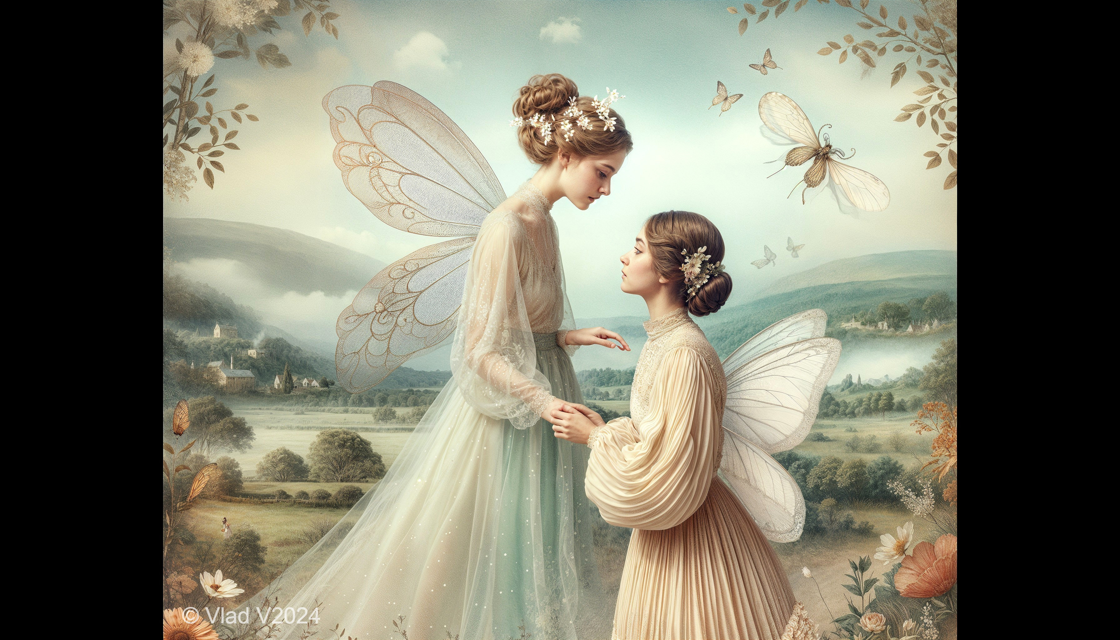 Two ethereal fairy figures share a tender moment in a serene, enchanted landscape. One has delicate wings and a flowing gown, while the other wears a soft, elegant dress, surrounded by nature.