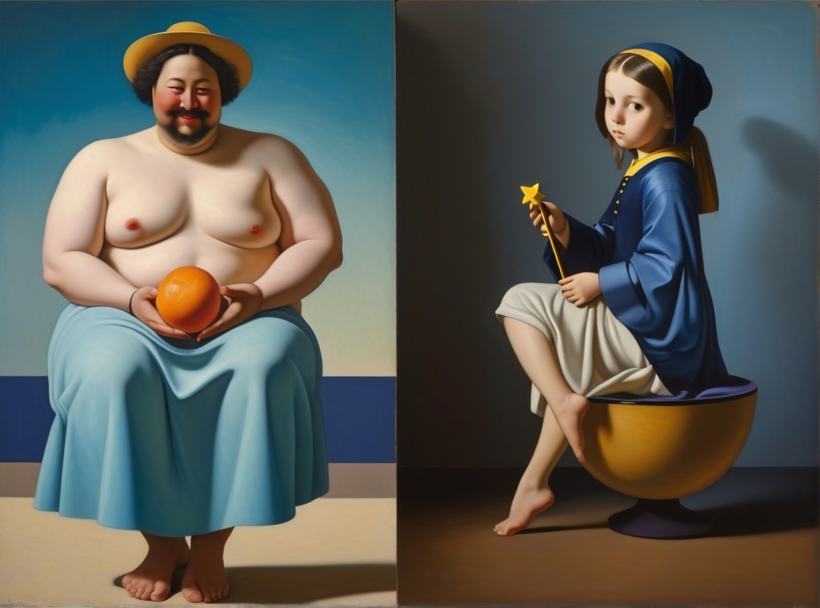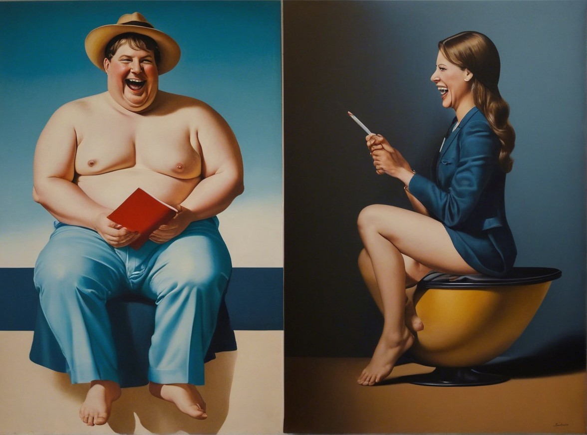 The image features two figures: on the left, an older man in a polka-dot shirt and hat seated by the sea, holding a cup; on the right, a young man in a blue suit and hat, elegantly posed on a geometric pedestal.