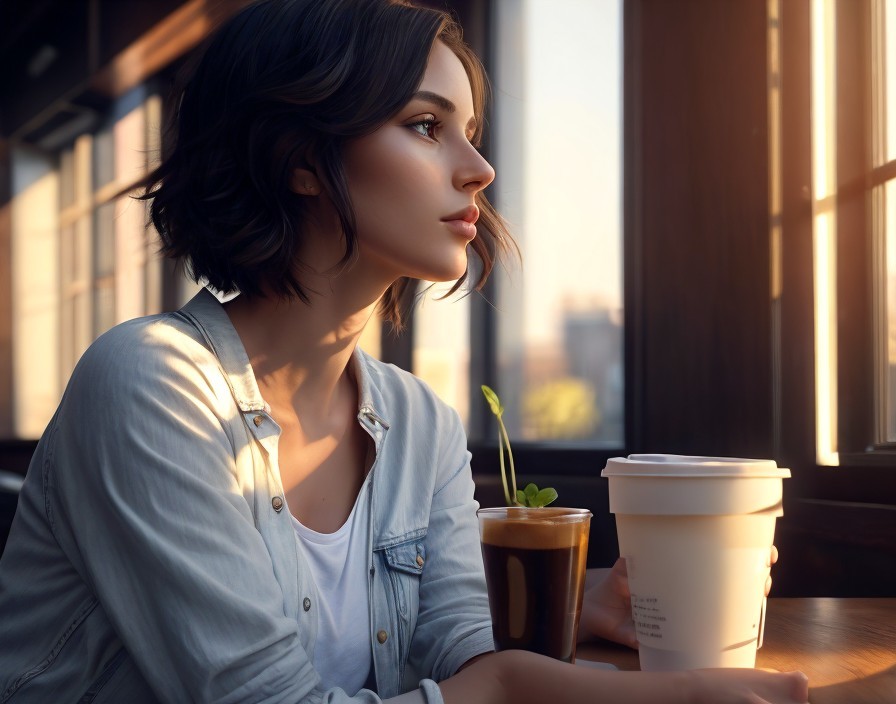 Prompt: Landscape shot of A beautiful shy 26 year old woman in jeans and a white t shirt and a jacket with a wavy bob and hazel eyes drinks demurely from a ultra small expresso cup in a well lit empty cafe, sun rays, light shimmer
