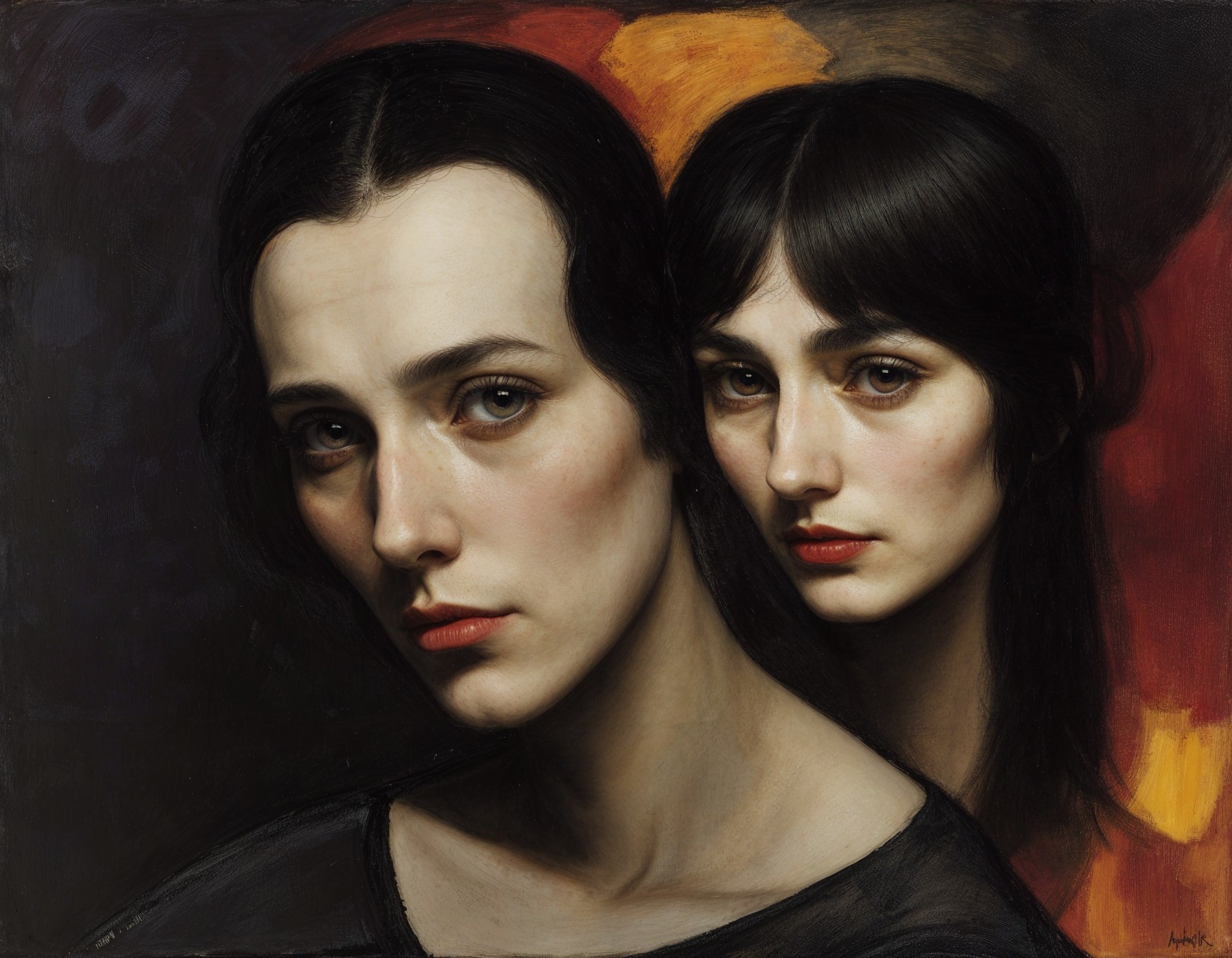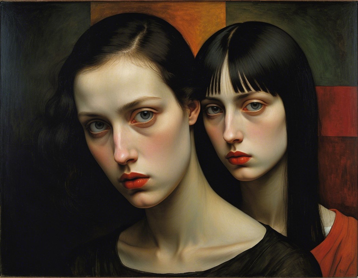 A haunting portrait of two girls with striking features, showcasing pale skin and intense gazes. One girl stands slightly behind the other, creating a sense of mystery and depth in the artwork.