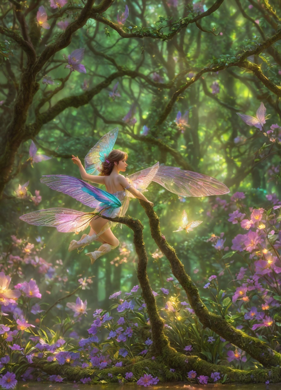 Three ethereal fairies with translucent wings amid blossoming flowers in an enchanted, misty forest.