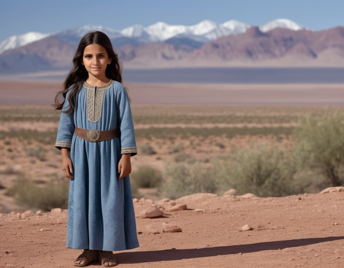 A girl (aged 7) with a desert and mountains on the horizon in the background.