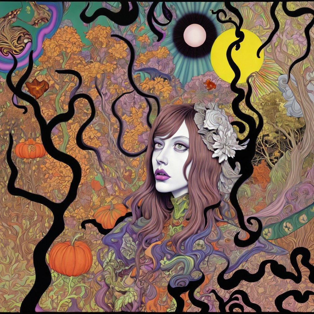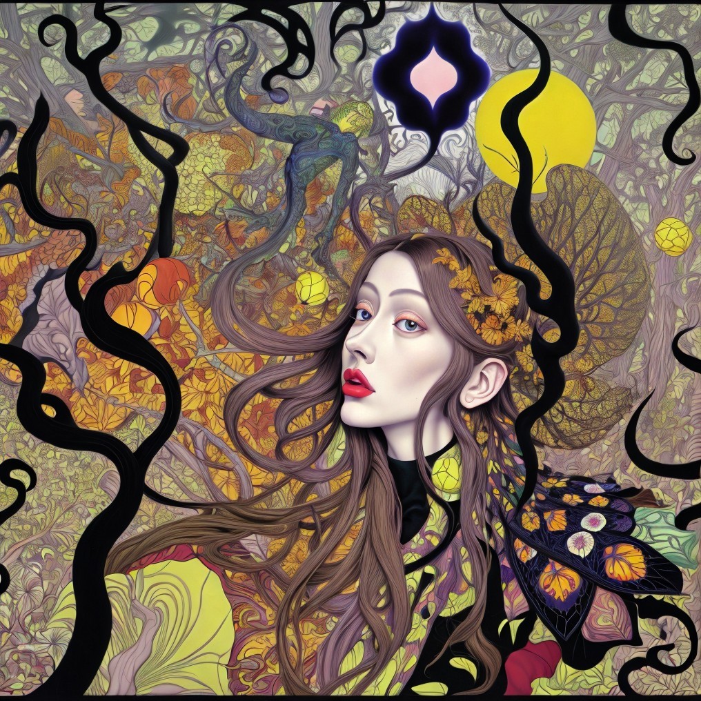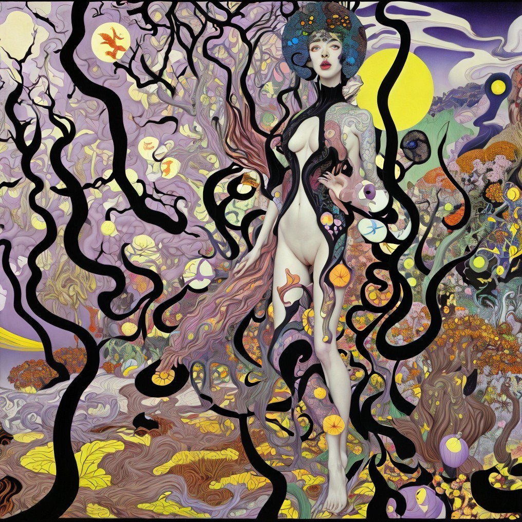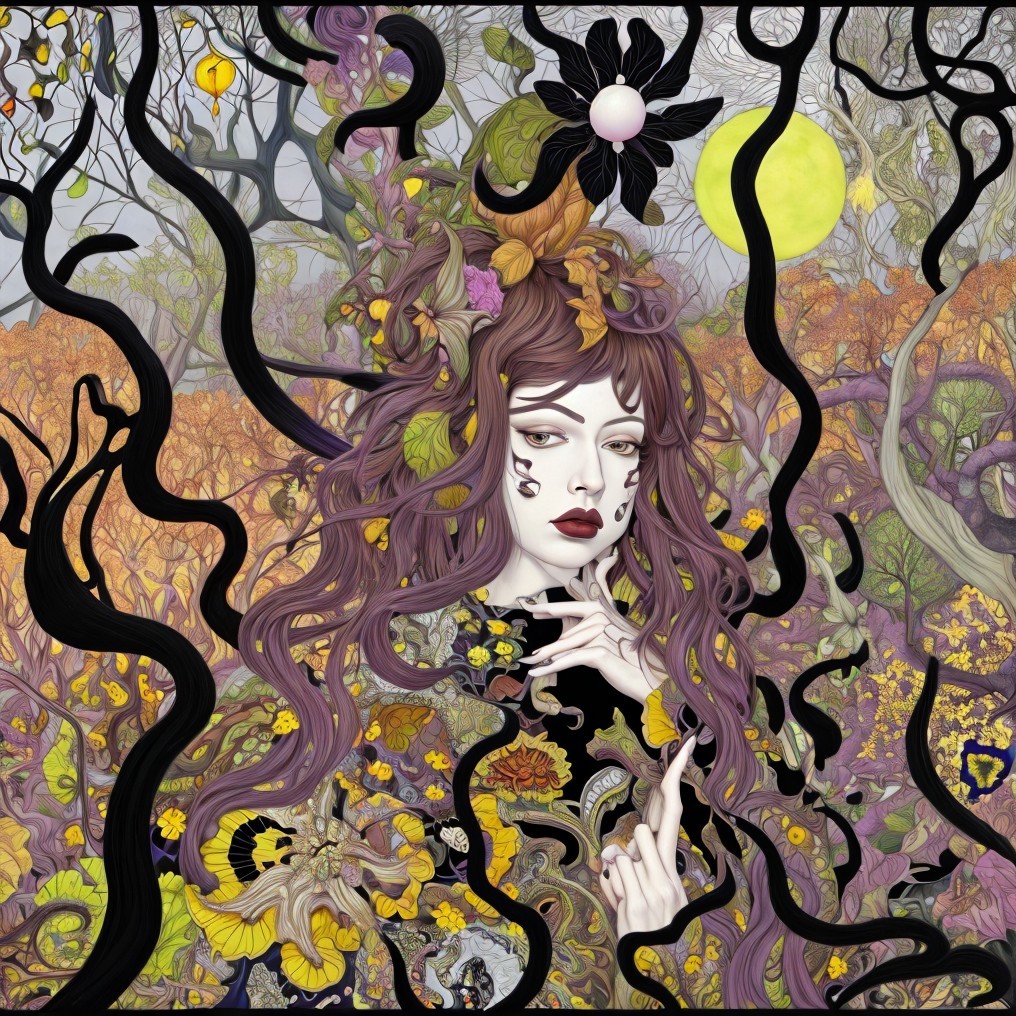 An artistic, stylized forest scene with twisted dark trees, yellow blooms, and a moon peeking through branches.