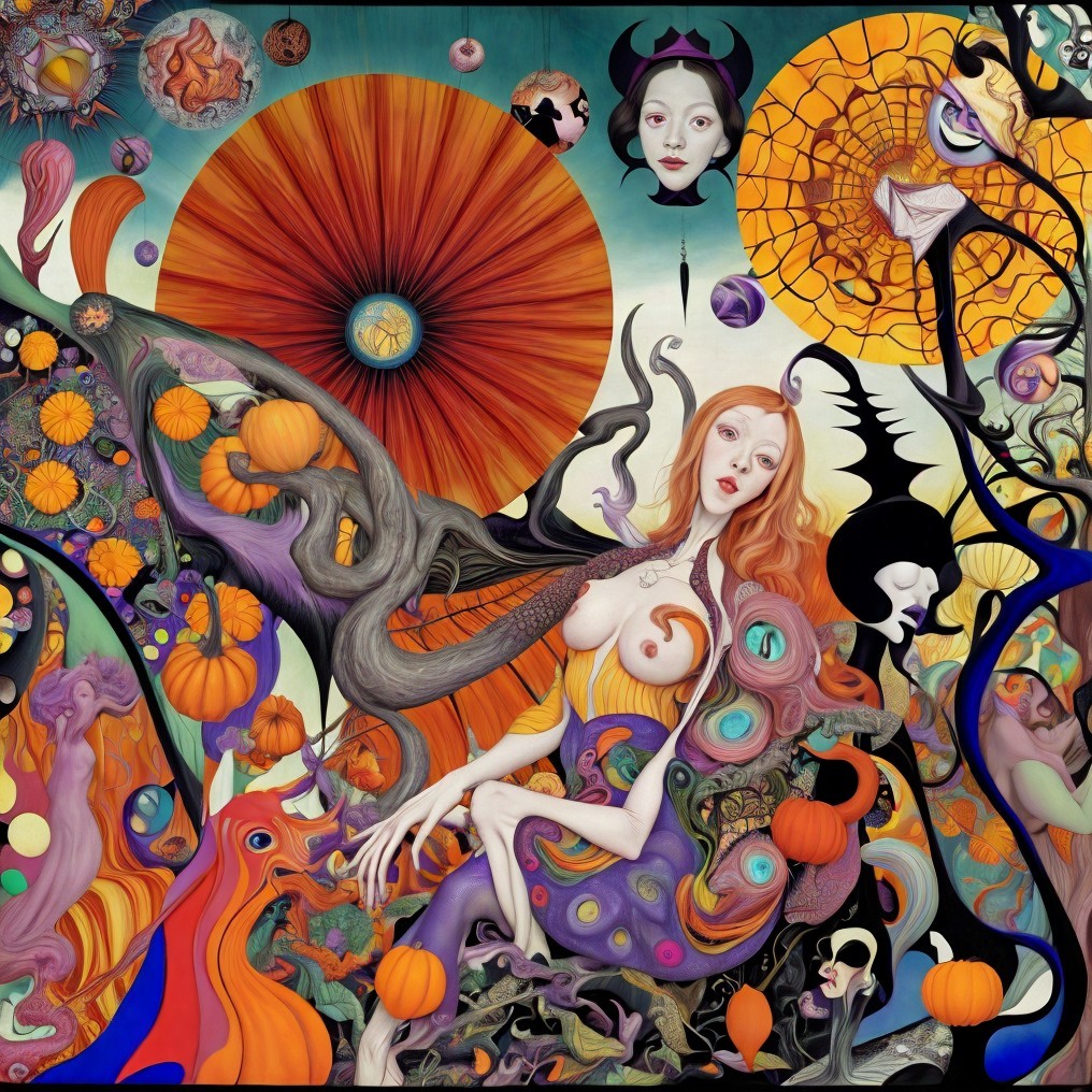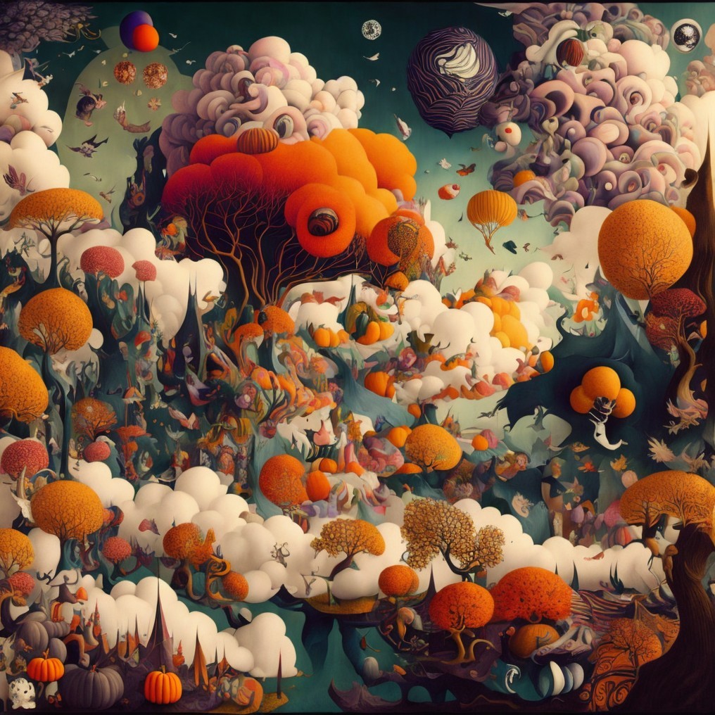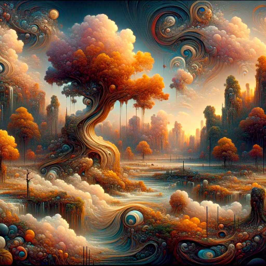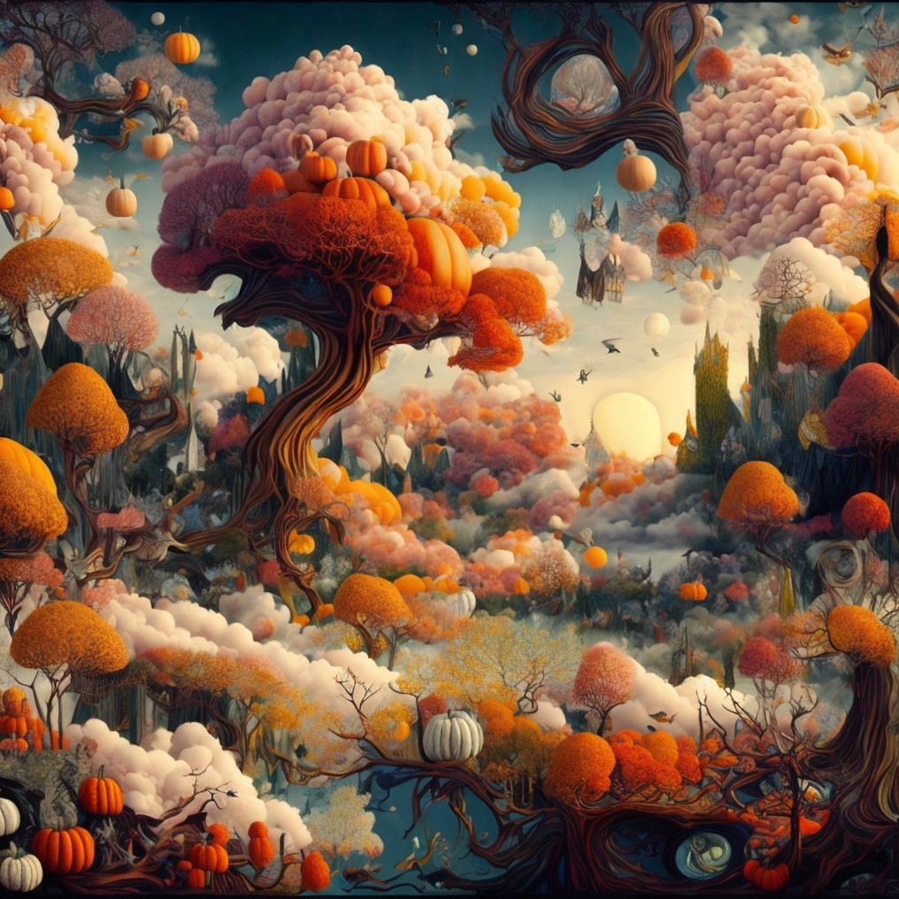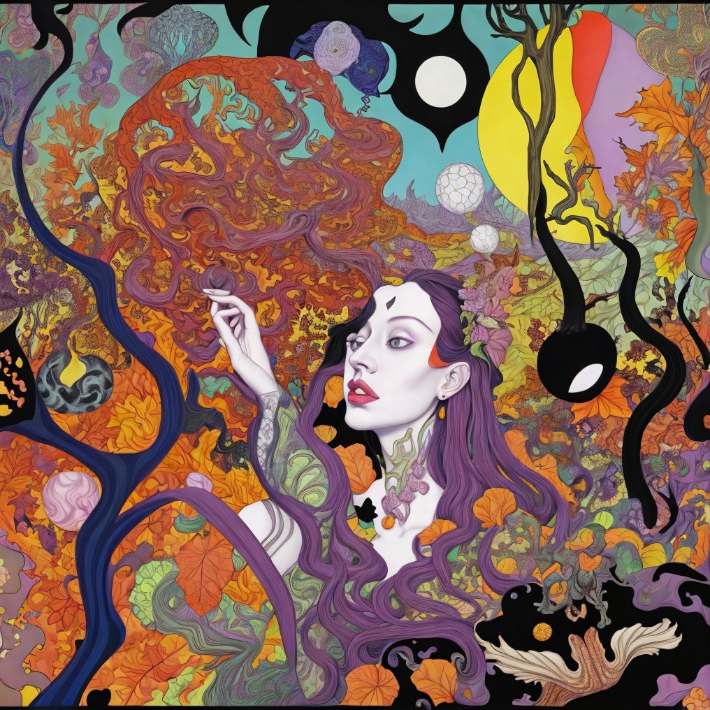 An artistic, stylized forest scene with twisted dark trees, yellow blooms, and a moon peeking through branches.