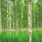 A serene forest scene bathed in soft morning light, featuring tall trees surrounded by a vibrant carpet of colorful flowers, including white tulips and bluebells, amidst a tranquil atmosphere.