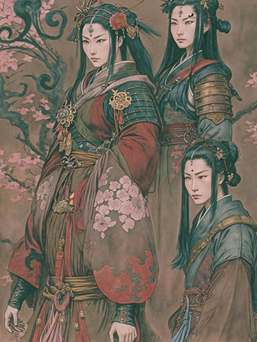 Dynamically & predominantly blue, green, red, bronze colored. Legend of the samurais of the underworld. Medieval Japanese Artists Sumi-e Style, Velvet Black, Shabby, Dull Gold, Amber Gray, Golden Ratio, Surreal Fantasy, Elegant, High Definition Ultra Fine 3D Line, Zenangle Style, Watercolor Patchwork ,