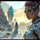 A futuristic landscape features a woman in a sleek, high-tech suit with vivid details, standing beside a serene figure in the background. Strange, glowing structures loom in the sunlit, snowy terrain.