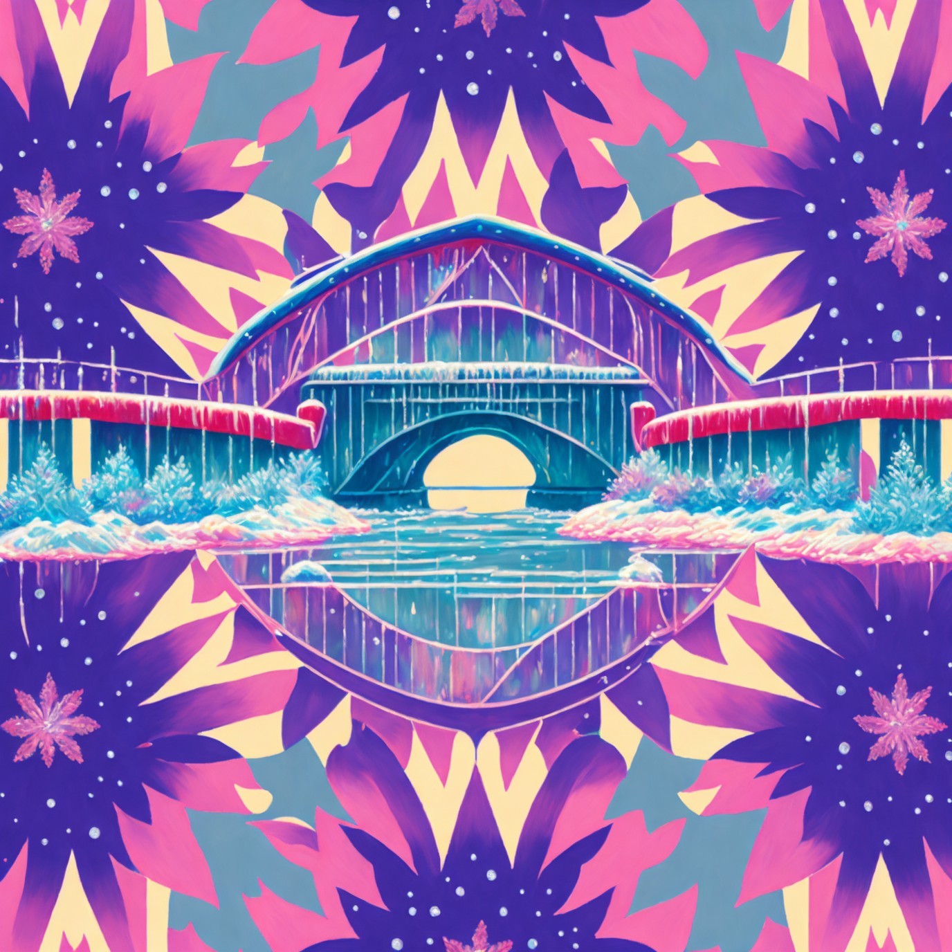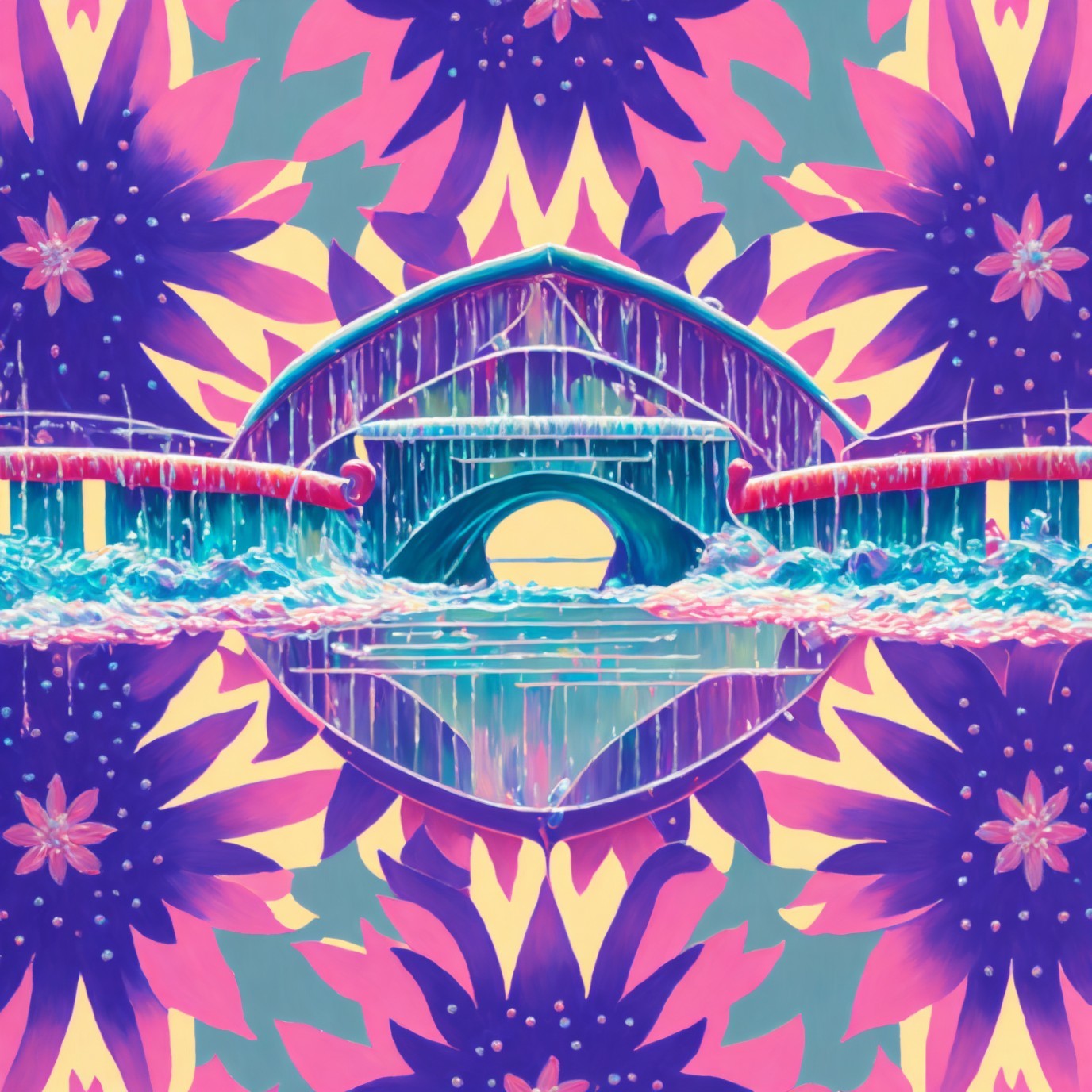 A vibrant, symmetrical artwork with a central eye-like motif surrounded by blue waterfalls and colorful, floral patterns.