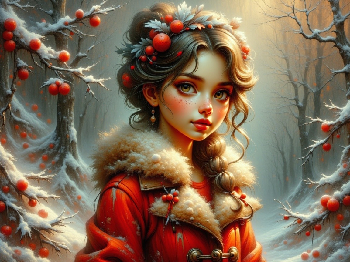 A fairytale-like hyperrealistic portrait of a young girl with flushed cheeks and freckles, wearing a red coat with a fuzzy brown collar and a winter berry crown, standing amidst a snowy forest with bare trees laden with snow and red berries, in a dreamlike surreal style, sharp focus, with dramatic