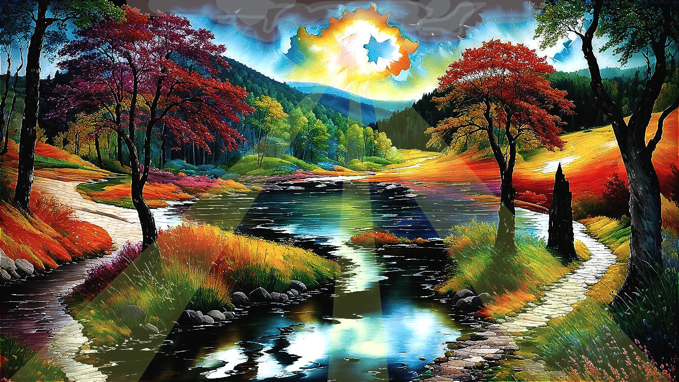 A vibrant landscape showcasing a winding path by a serene river, flanked by colorful trees in autumn hues. The sun sets behind distant mountains, casting warm light over the scene.