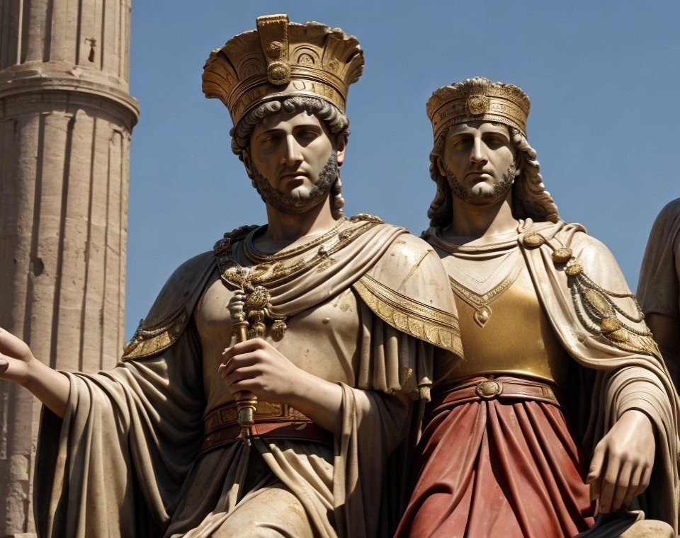 The image depicts two regal figures wearing elaborate crowns and adorned garments, exuding a sense of power and authority, set against a clear blue sky. Their expressions convey wisdom and strength.