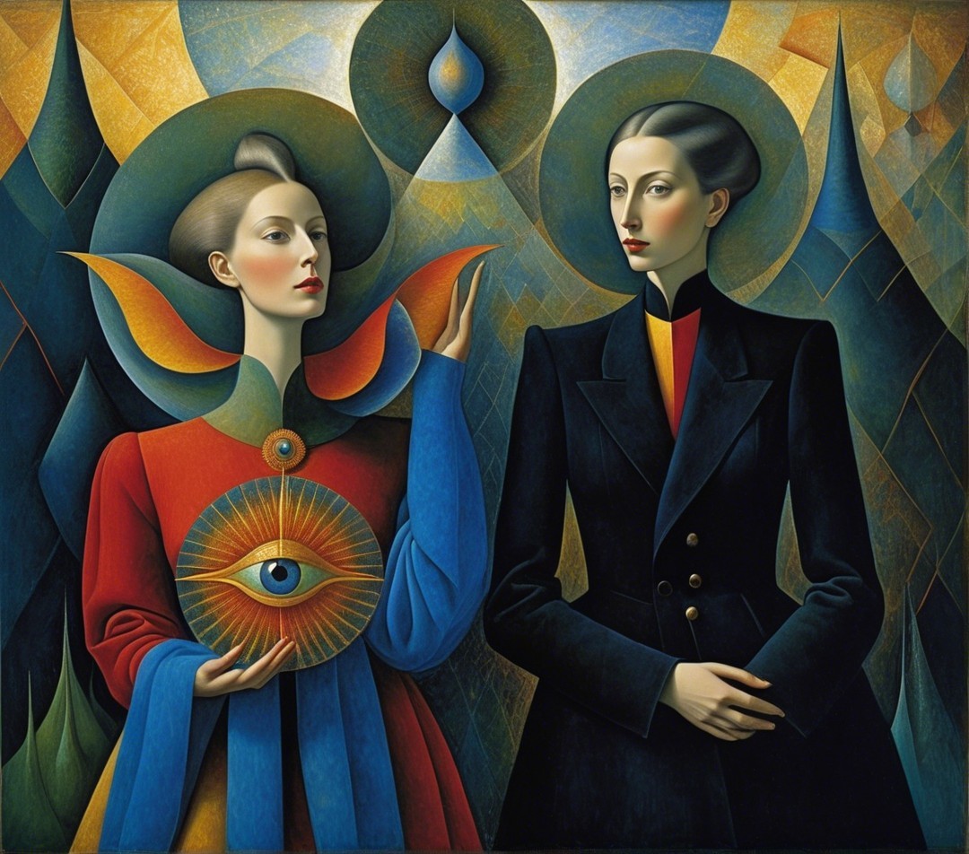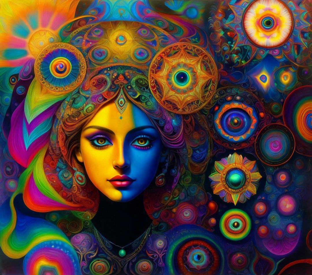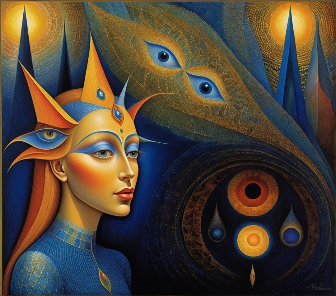 A single image, psychedelic siren, style of Alex Grey, style of Remedios Varo, style of Paul Klee, style of Leonora Carrington, eye contact, soft, beautiful delicate interplay of light and shadows on every surface, exotic, vivid, radiant, kaleidoscopic, highly colorful, most complex and highly intricate, dominant golden and indigo but colors, highly intricate and utterly complex designs and patterns, exciting. Prompt by Vishrut Abhinna.