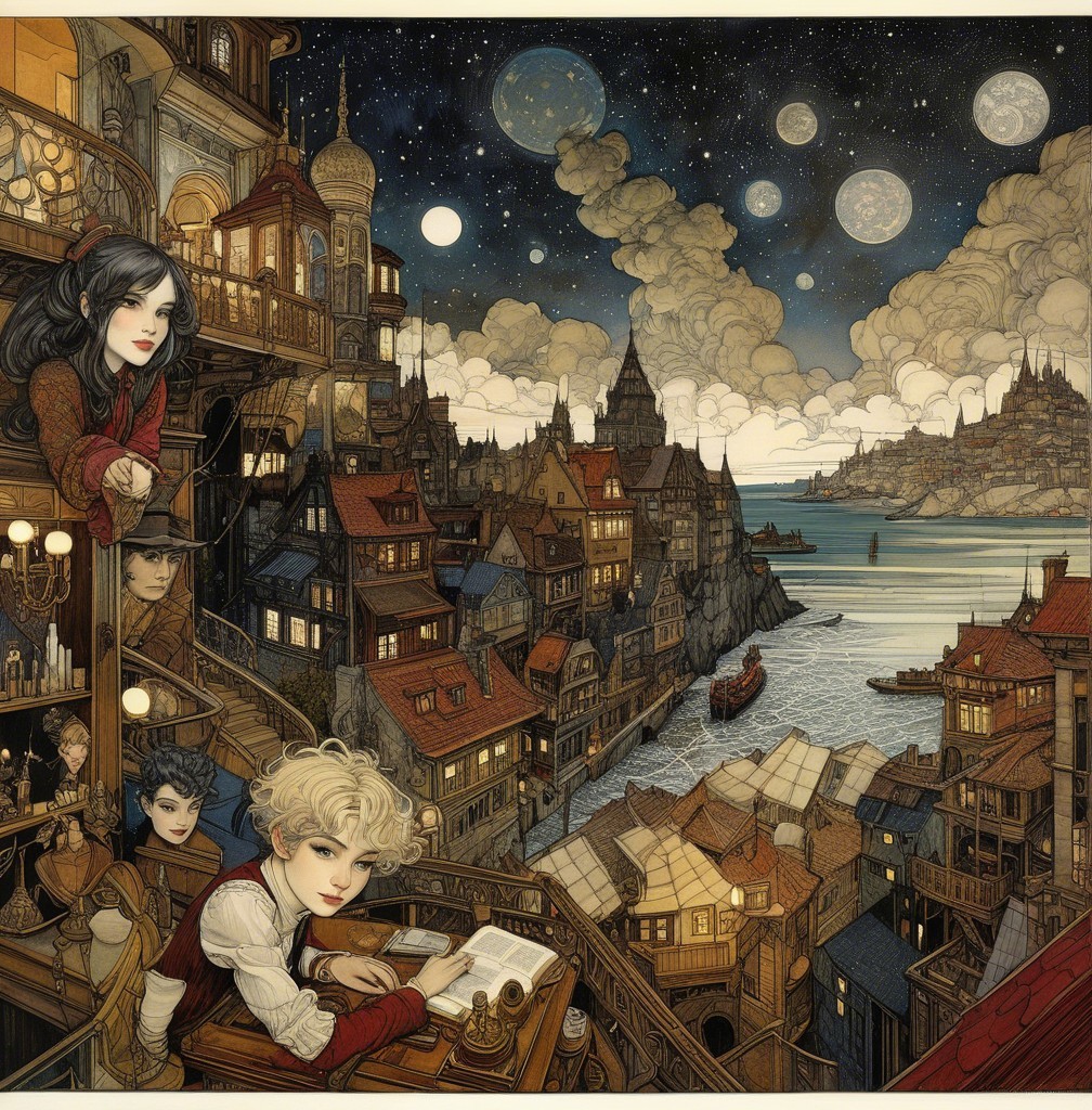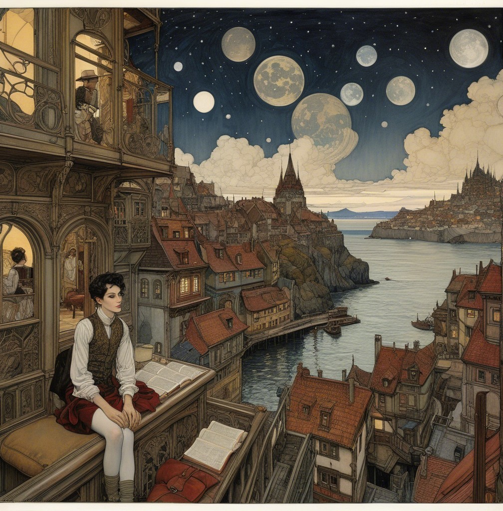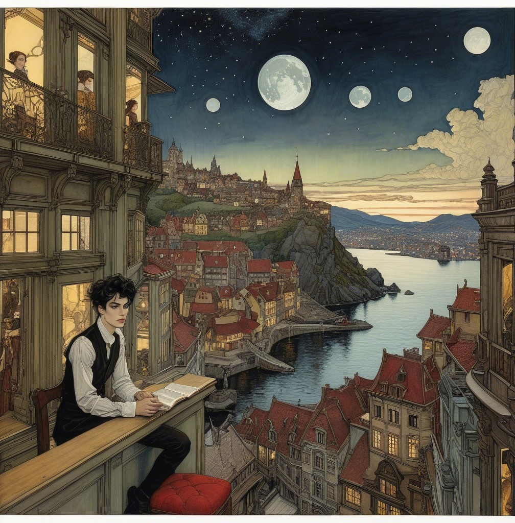 A serene evening scene depicts a young man reading on a balcony overlooking a picturesque city by the water. The moon and stars shine above, while soft lights glow in nearby windows.
