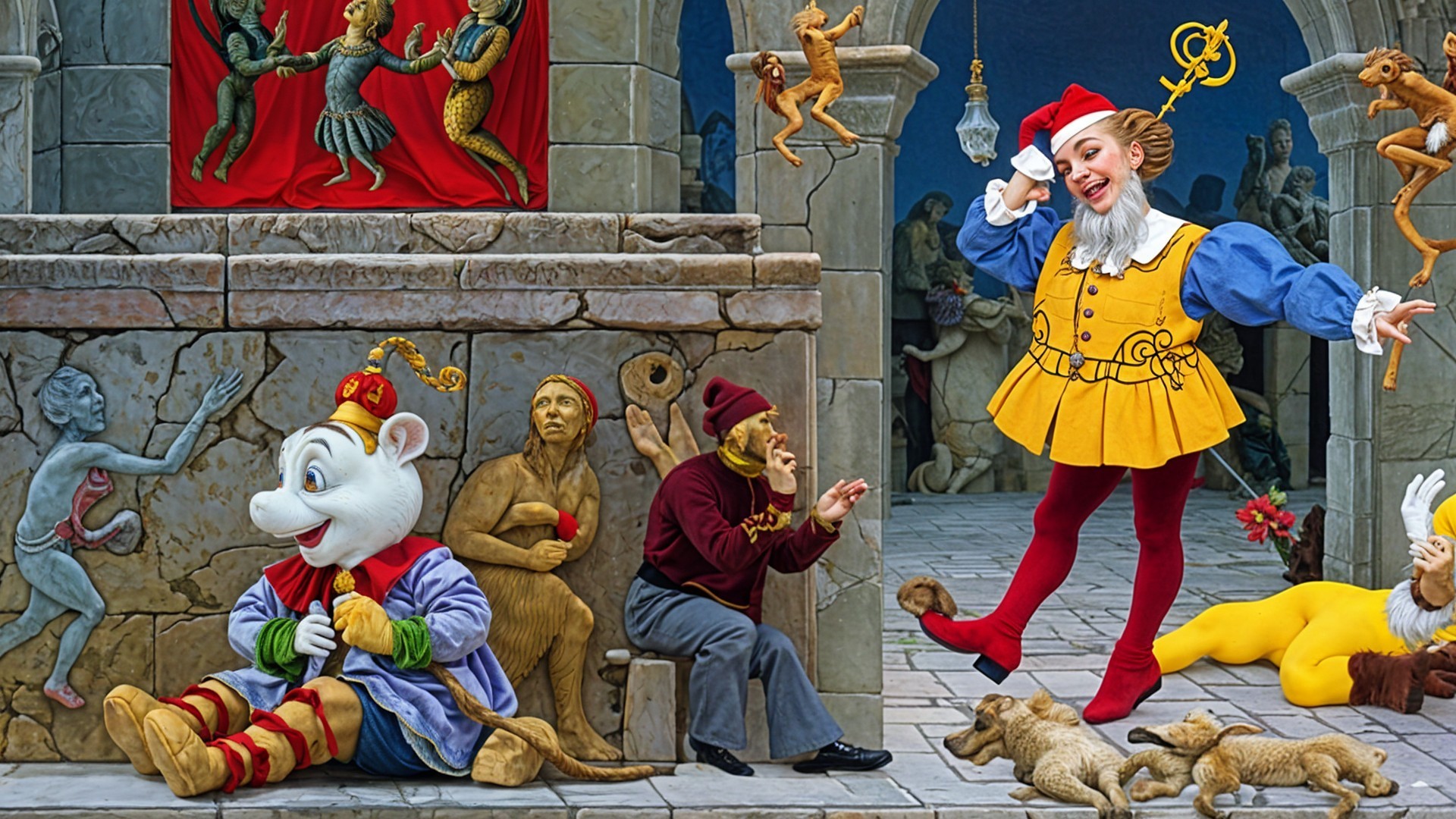 The image depicts a colorful, whimsical scene featuring three characters in vibrant costumes. One sits with a string instrument, while the others, in playful outfits, add to the lively atmosphere.