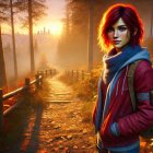 Sunny stands on a forest path, surrounded by autumn foliage. The warm sunset casts a golden hue, enhancing the serene and picturesque landscape.