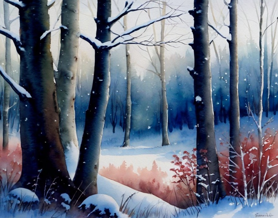 Child in Red Coat Walking Through Snowy Forest with Falling Snowflakes